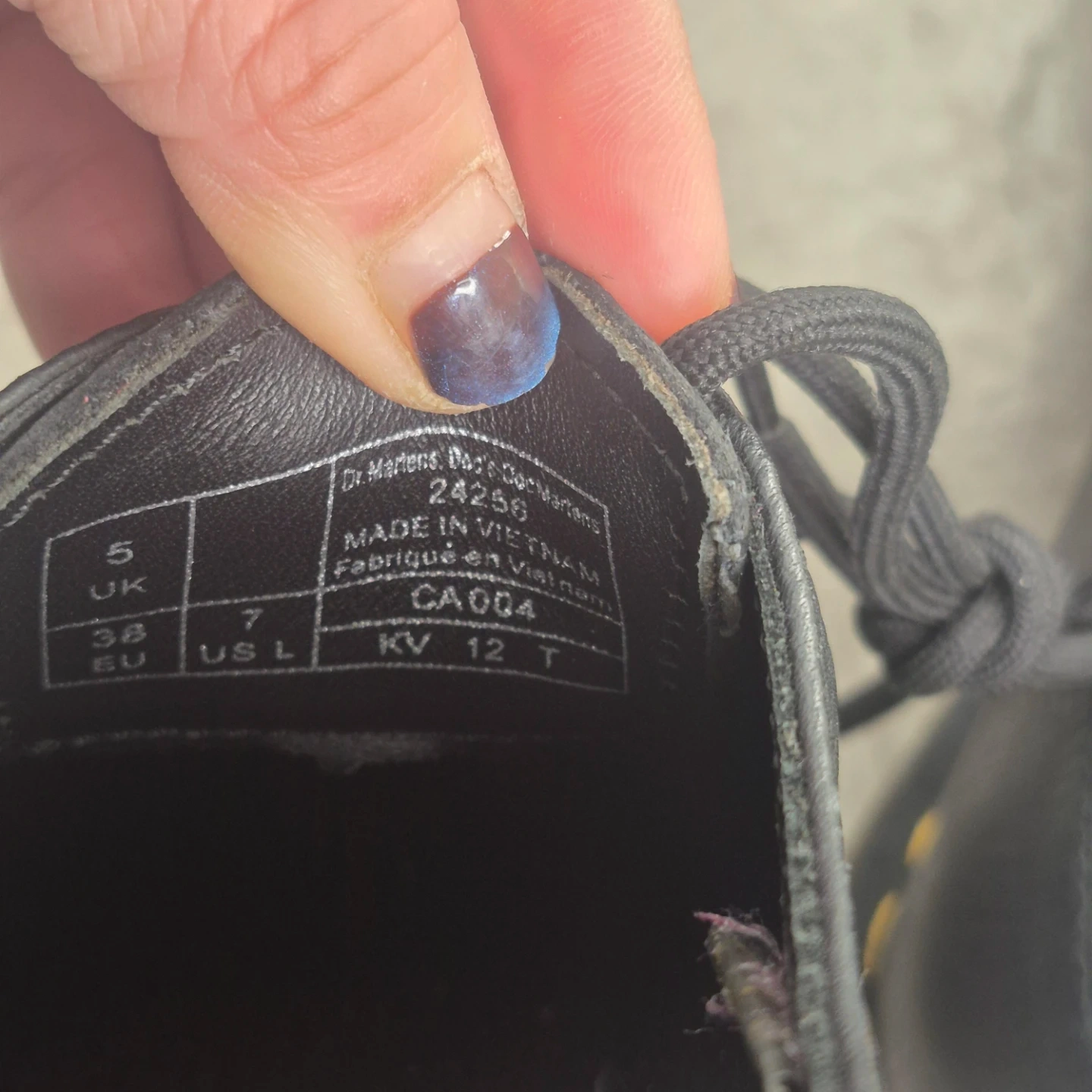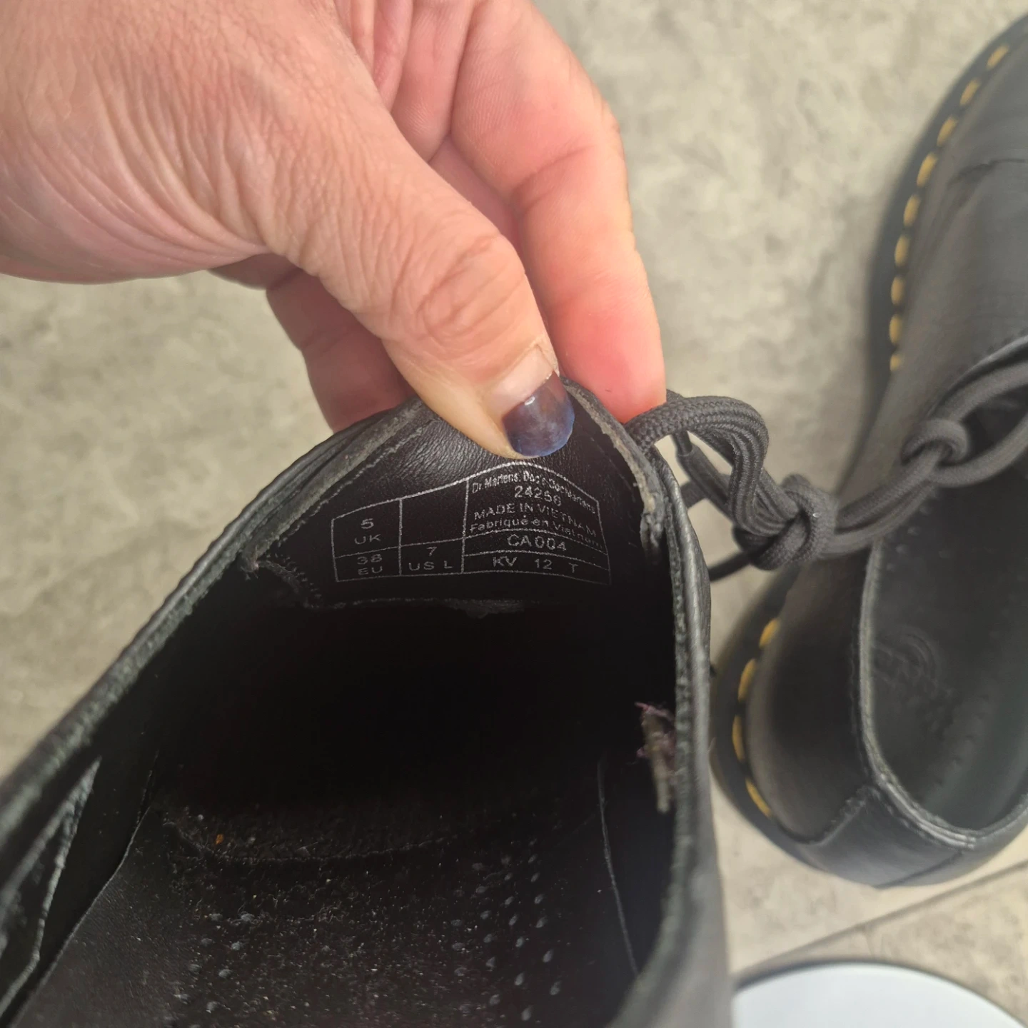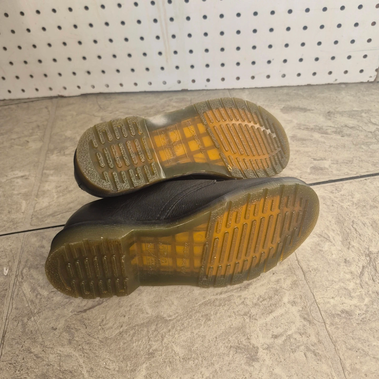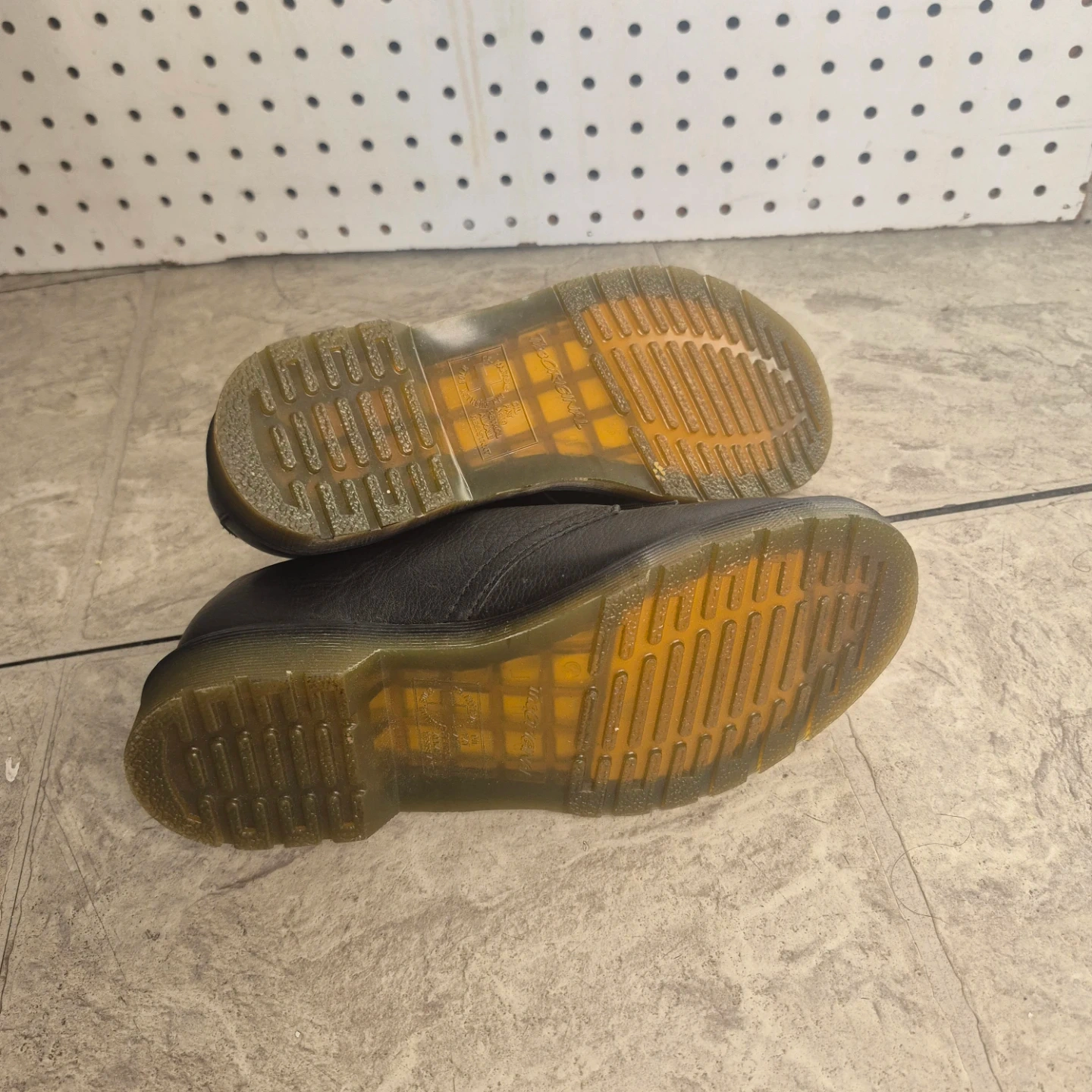 Classic Dr. Martens black leather Oxford shoes. These durable shoes feature a pebbled leather upper and the signature yellow stitching. Perfect for everyday wear and built to last!
