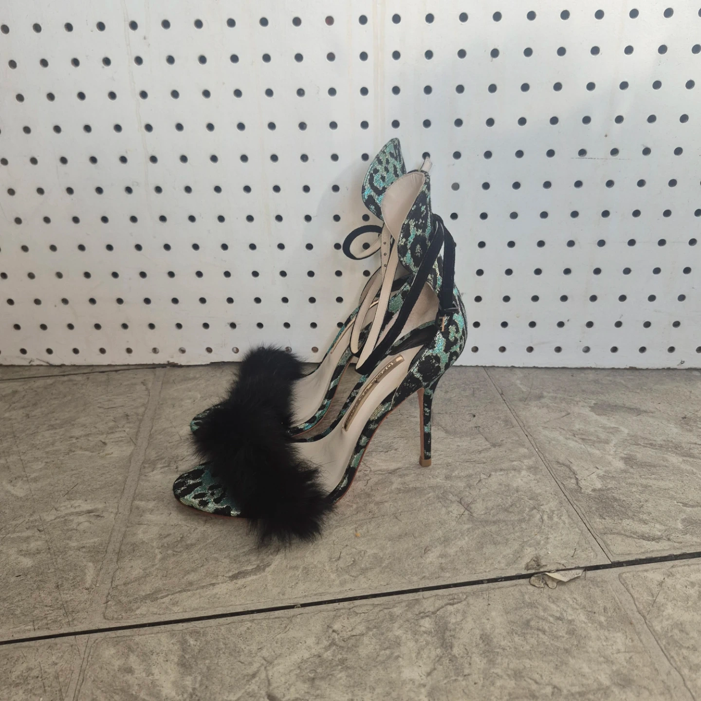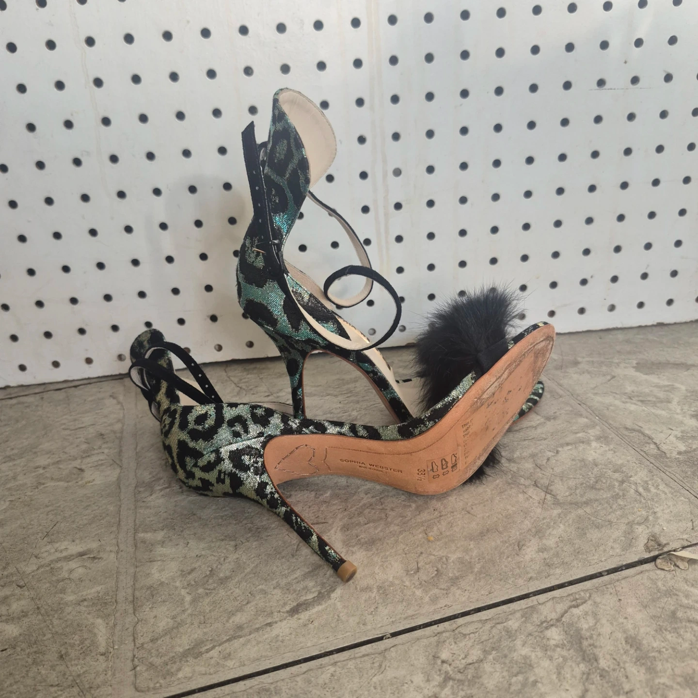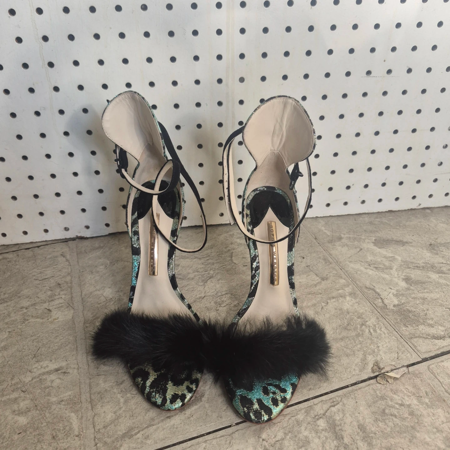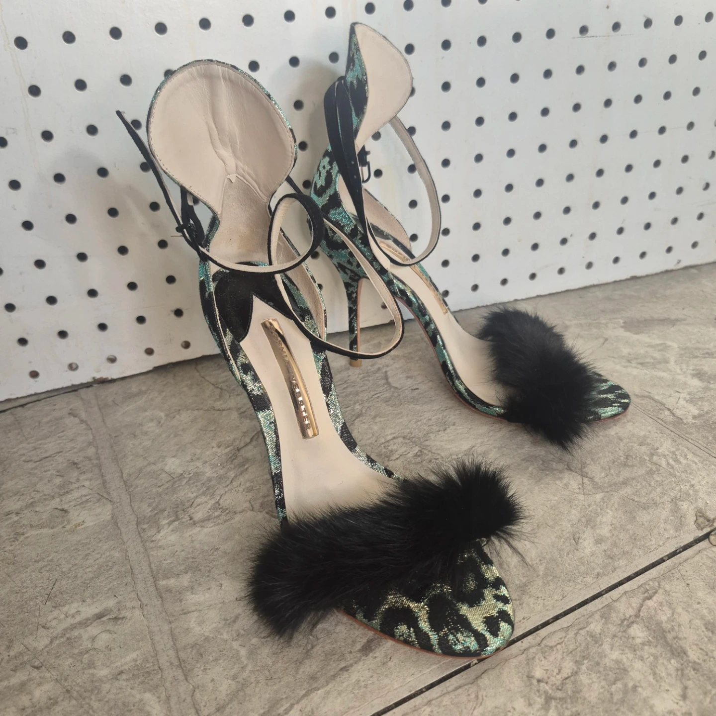 Sophia Webster women's heels with a black fur trim and a patterned sequin exterior. These statement heels feature ankle straps and a stiletto heel. They're sure to turn heads!