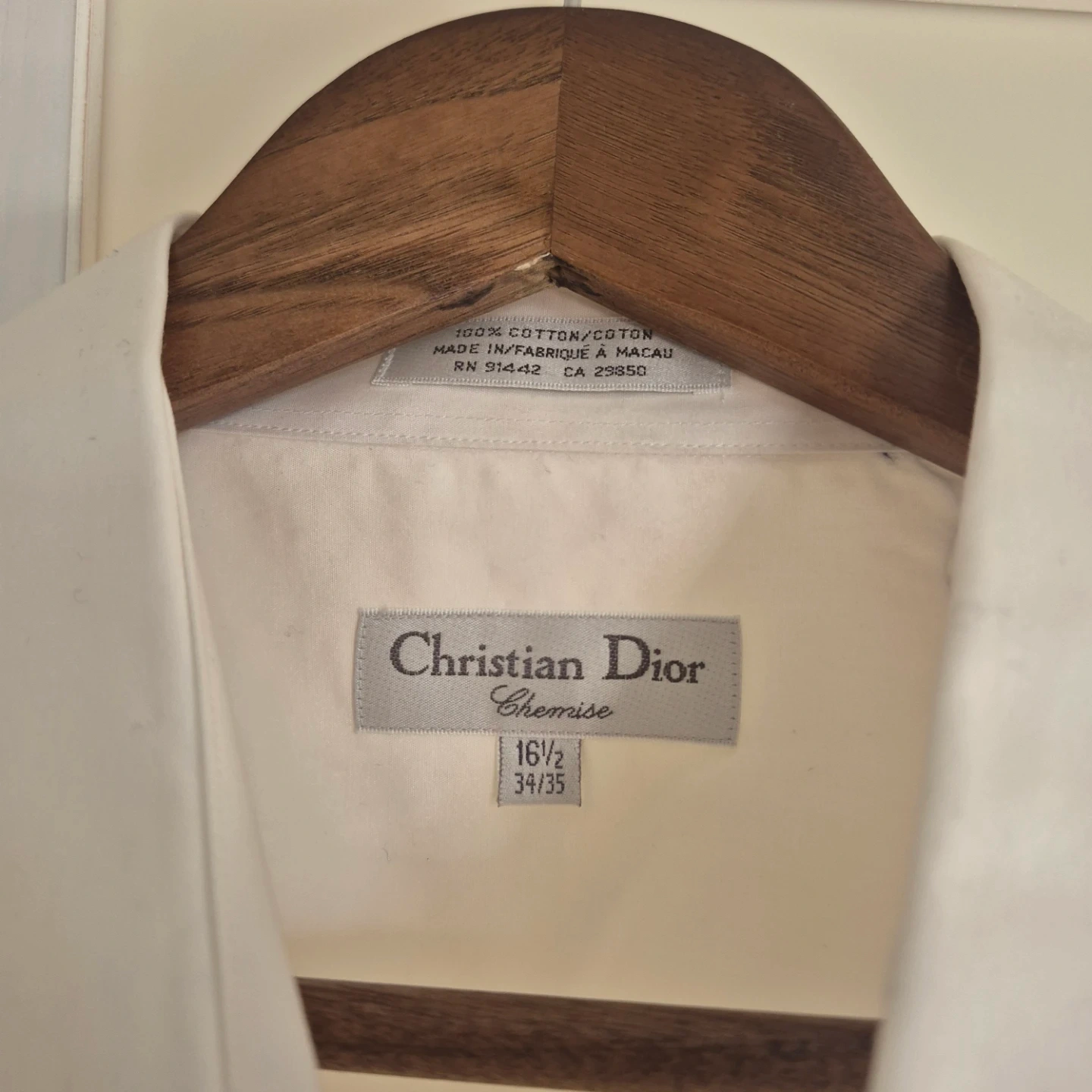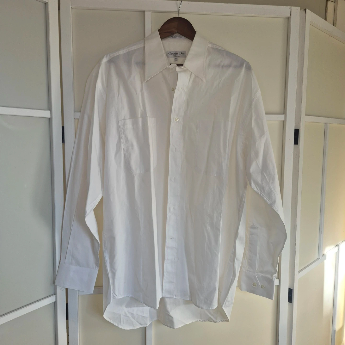 Classic white dress shirt from Christian Dior. Made of 100% cotton. Features two chest pockets and button-up closure. Size 16 1/2 (34/35).