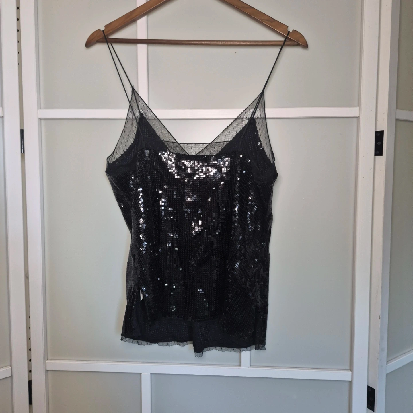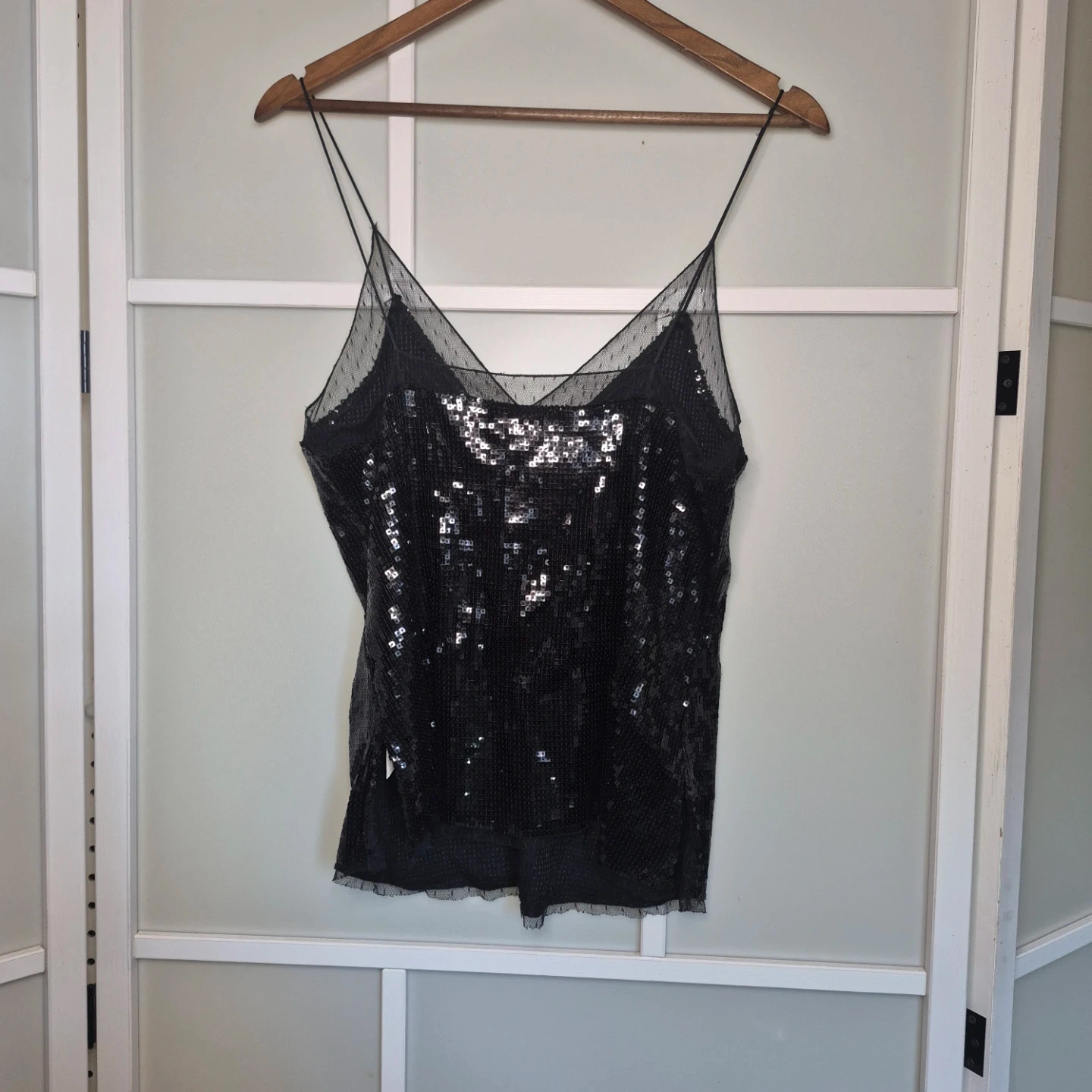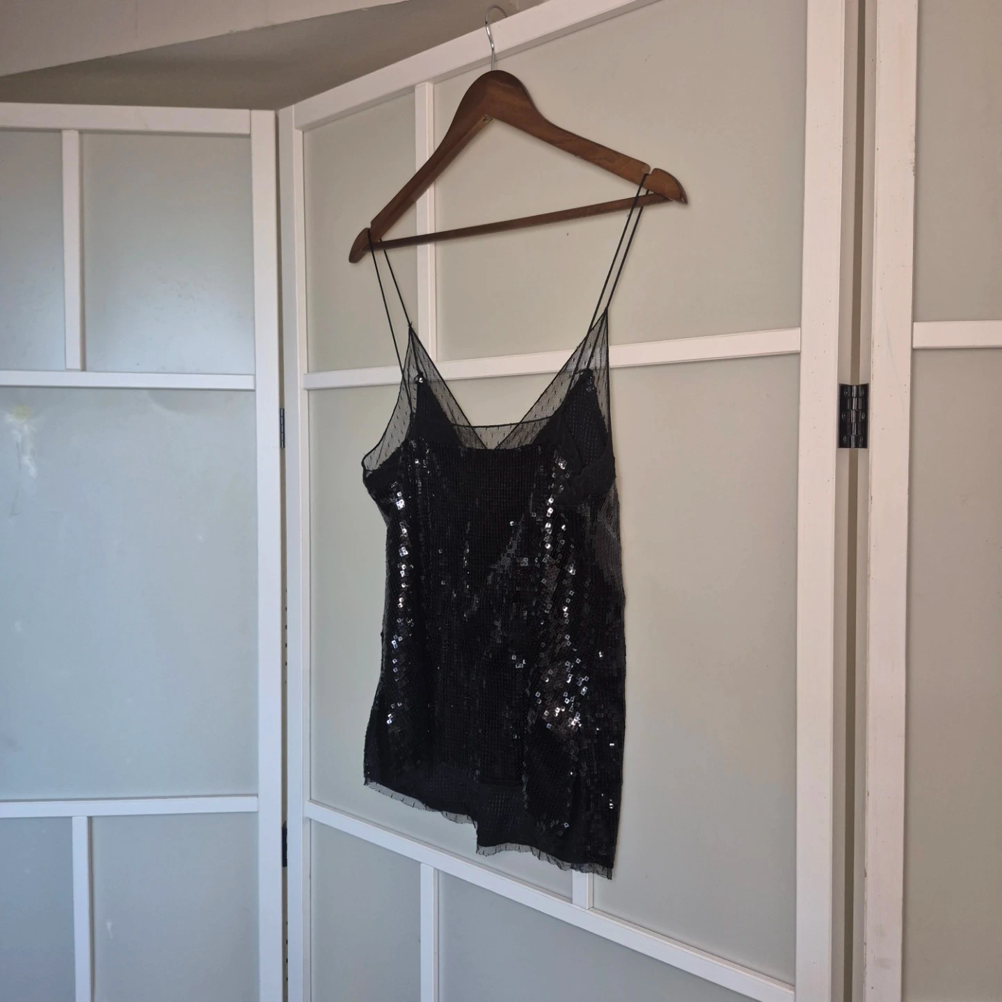 Sparkly black cami top adorned with all-over sequins. Features a delicate sheer mesh neckline with subtle polka dots and thin spaghetti straps. Perfect for dressing up any outfit!