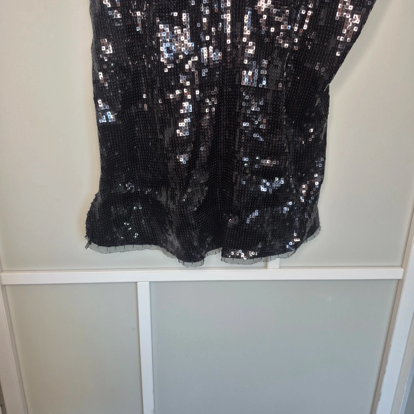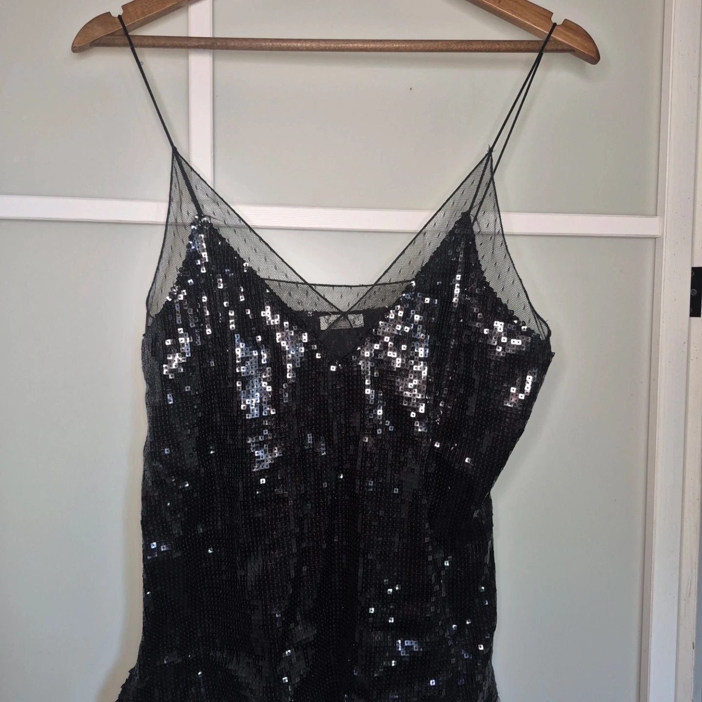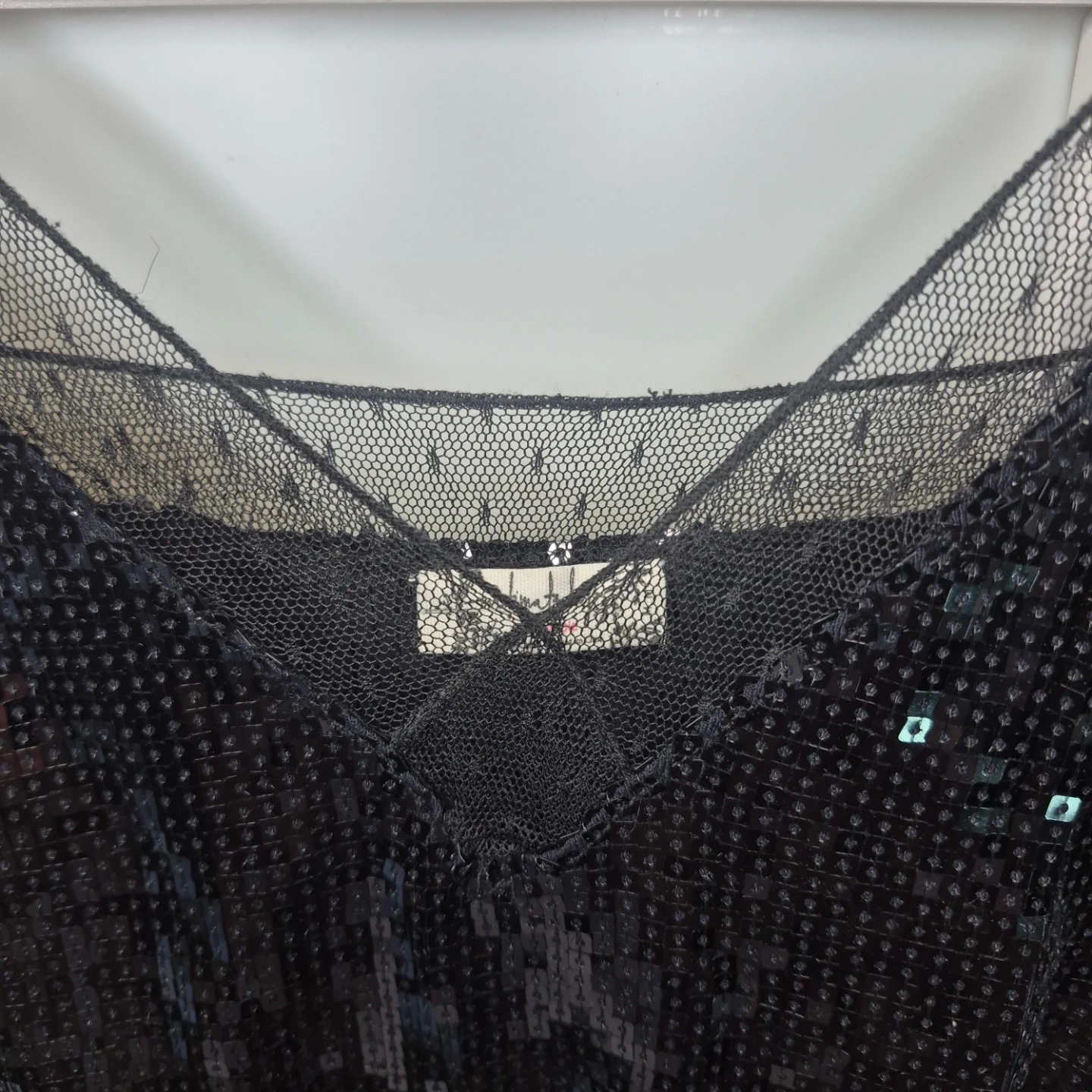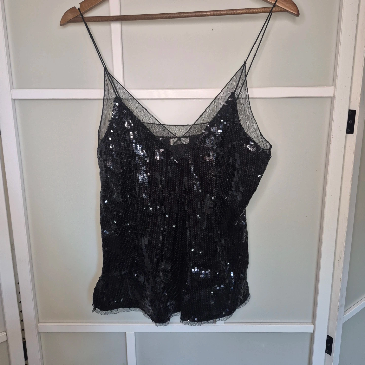 Sparkly black cami top adorned with all-over sequins. Features a delicate sheer mesh neckline with subtle polka dots and thin spaghetti straps. Perfect for dressing up any outfit!