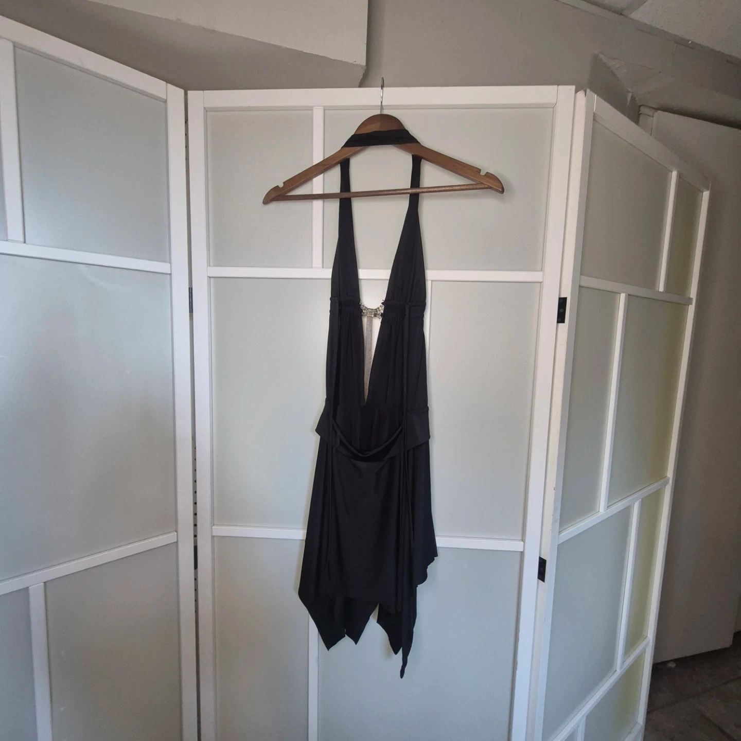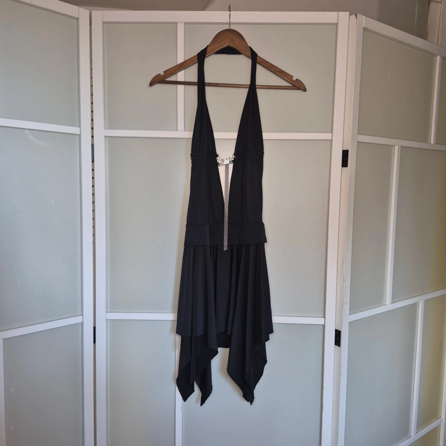 This black halter neck dress features a plunging V-neckline accented with a sparkling rhinestone chain detail. It has a layered, asymmetrical hemline for a flowing silhouette. Made of a lightweight, drapey fabric.
