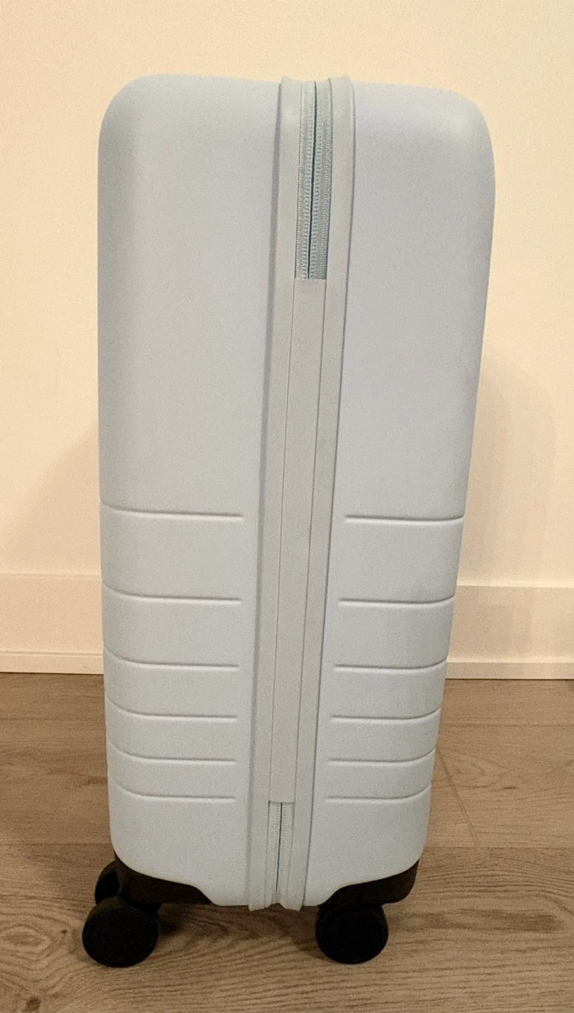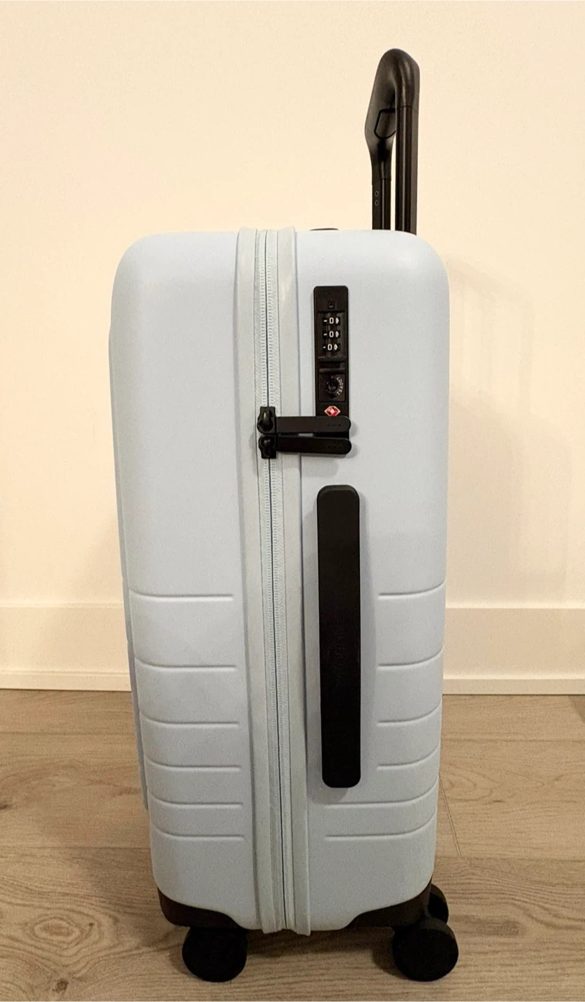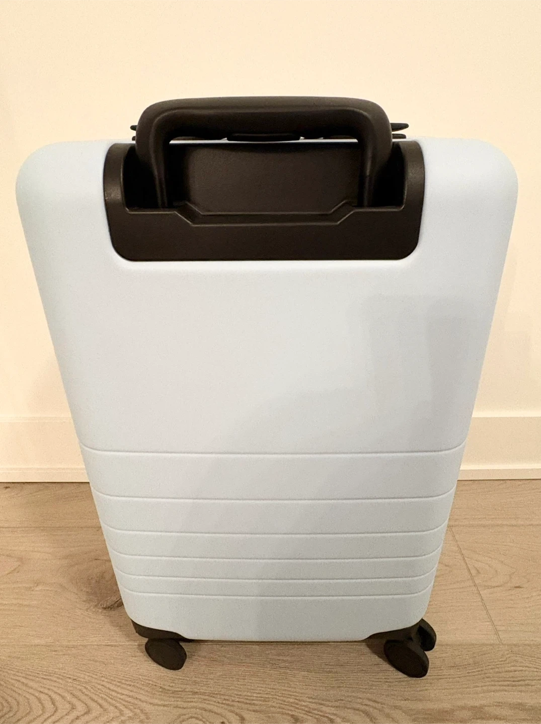 It's a hard-shell suitcase with a telescoping handle and spinner wheels. Made with durable polycarbonate.