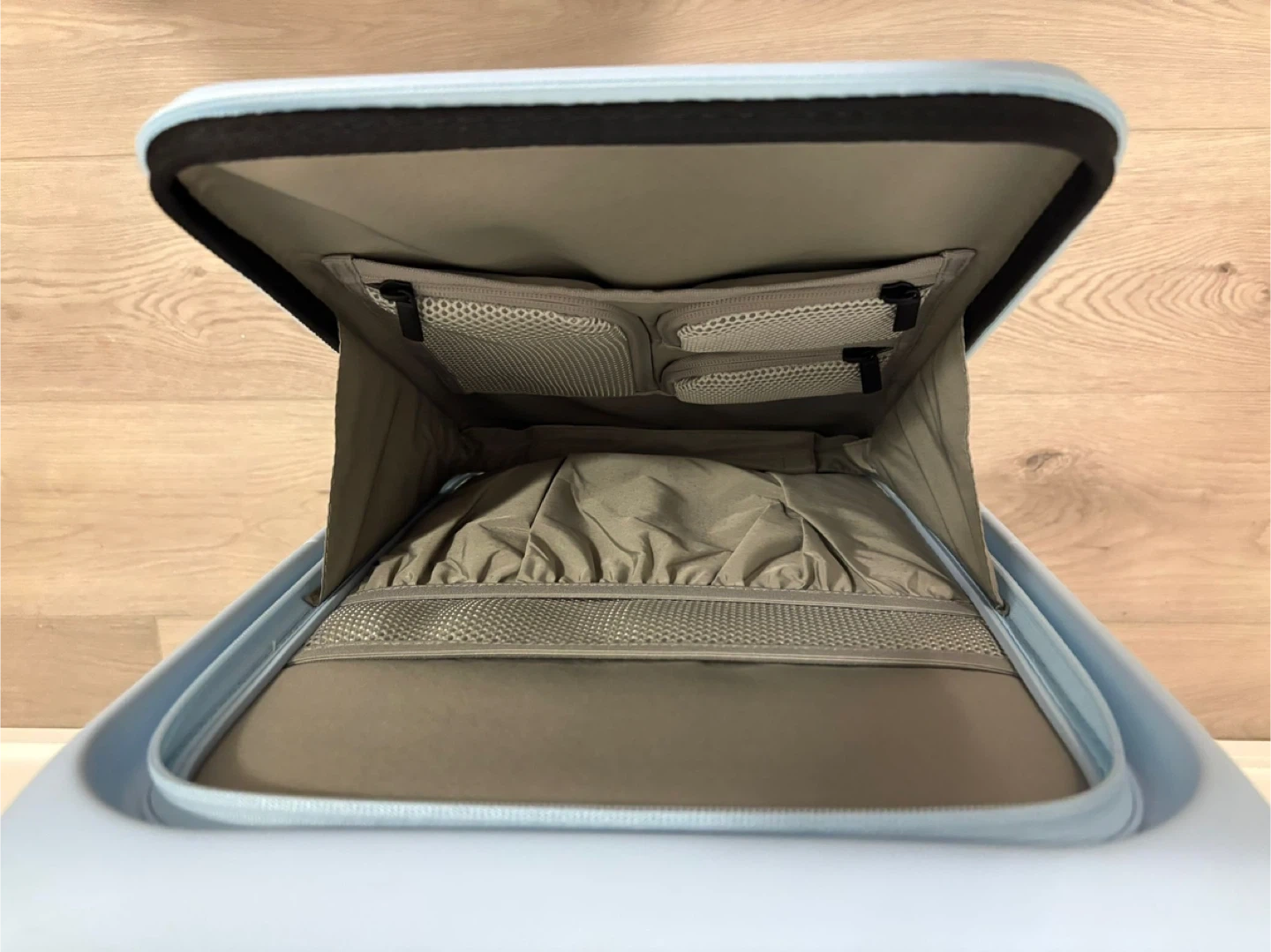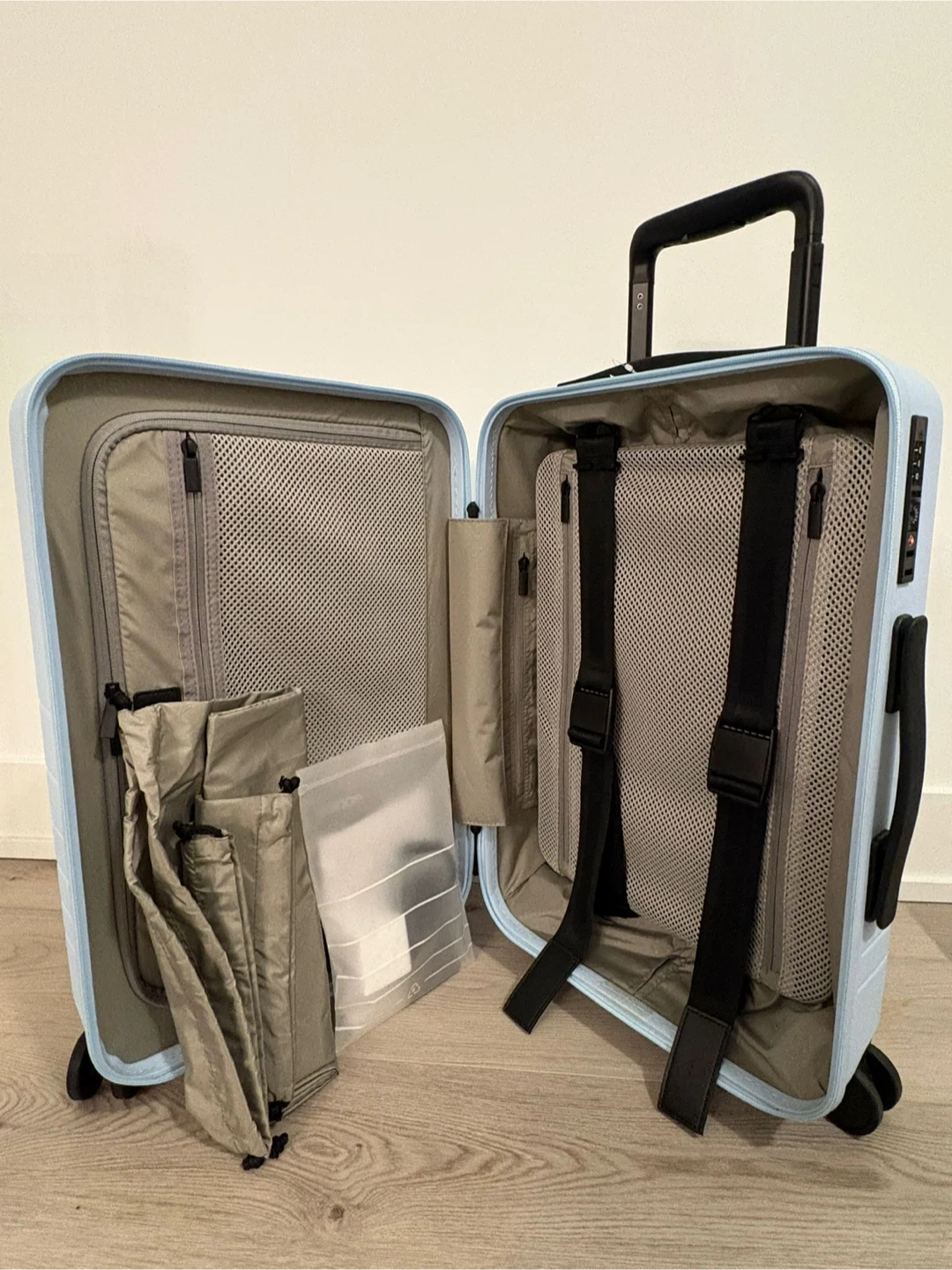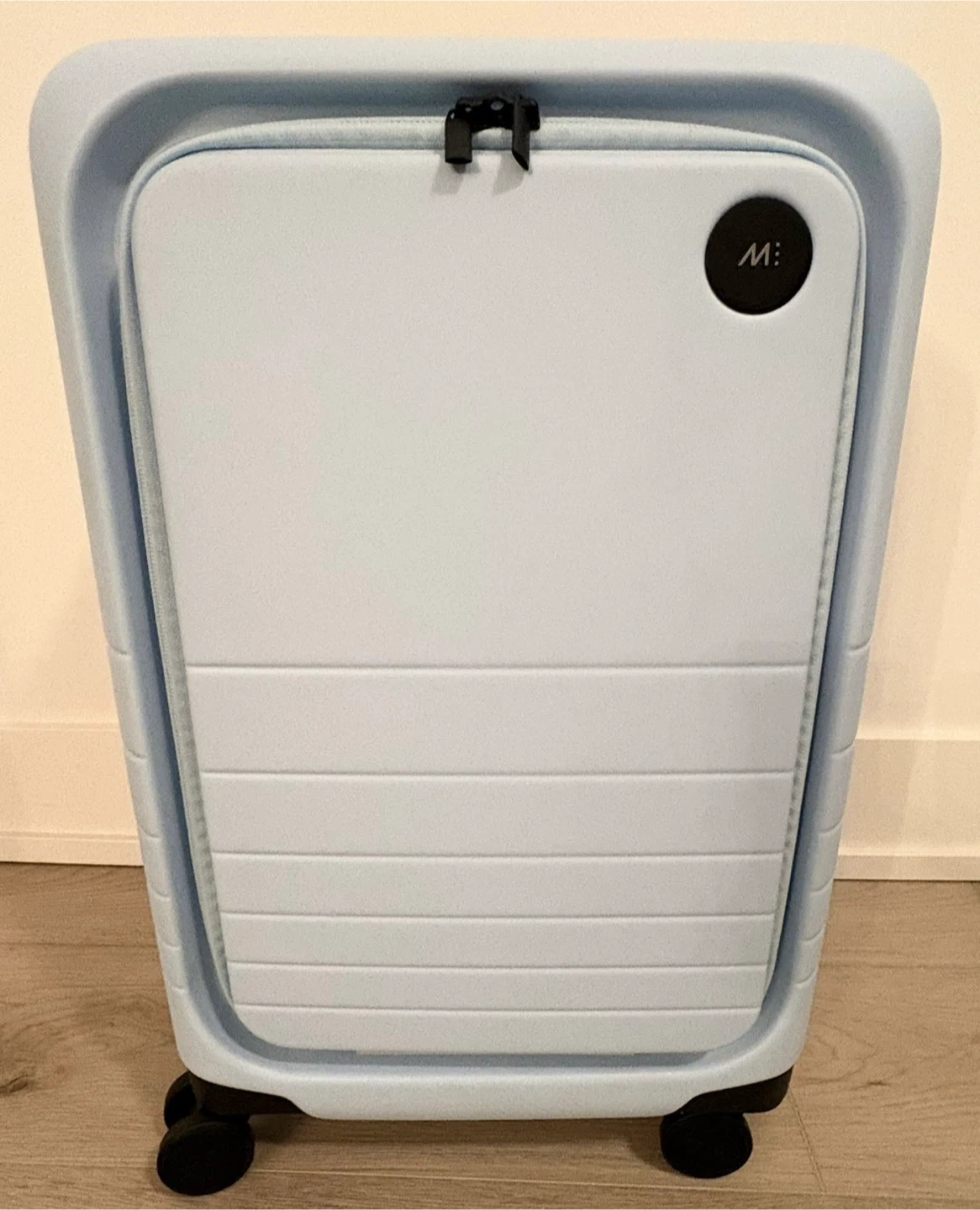 It's a hard-shell suitcase with a telescoping handle and spinner wheels. Made with durable polycarbonate.