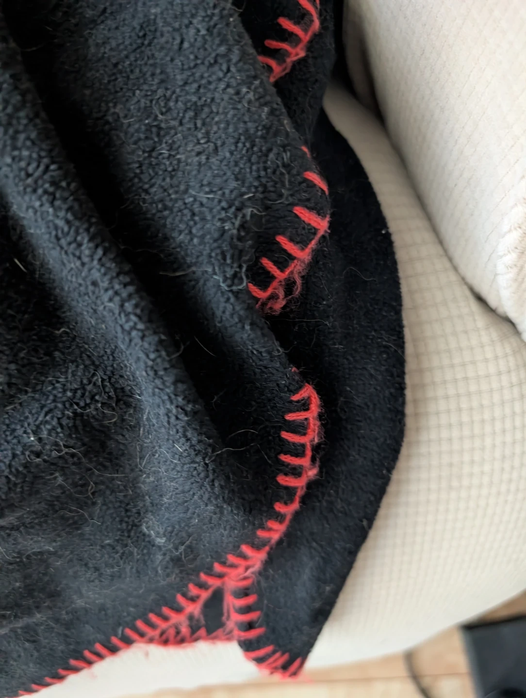 Black fleece throw blanket featuring the BC Lions logo. It's edged with red stitching. Measures approx. 45" x 60". It is unused and has been in storage. It is from about the year 2000. $20