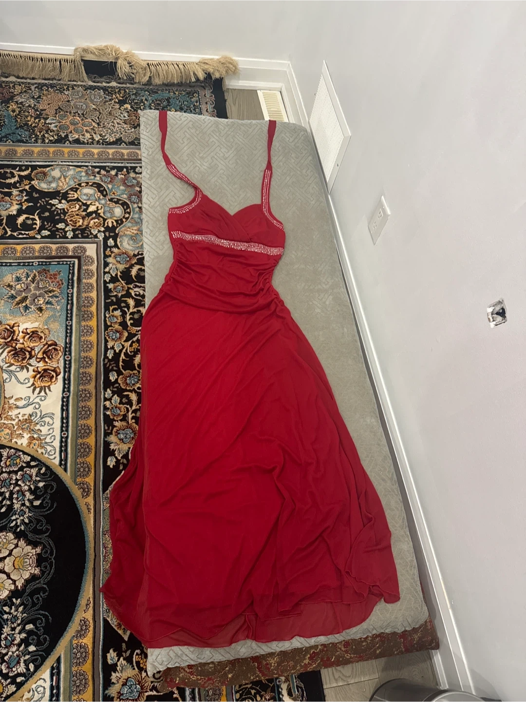 Flowy red maxi dress with a flattering ruched bodice. It's detailed with sparkling rhinestones along the neckline and waistline. Perfect for a special occasion!
