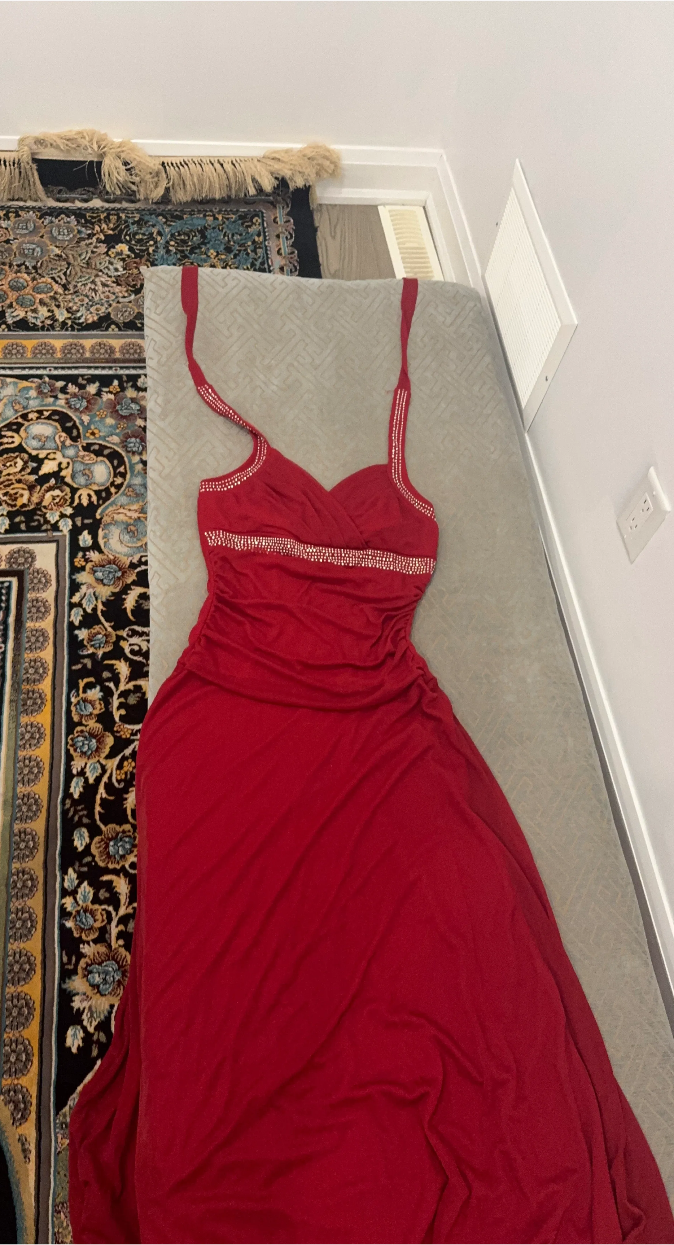 Red Ruched Maxi Dress with Rhinestone Embellishments