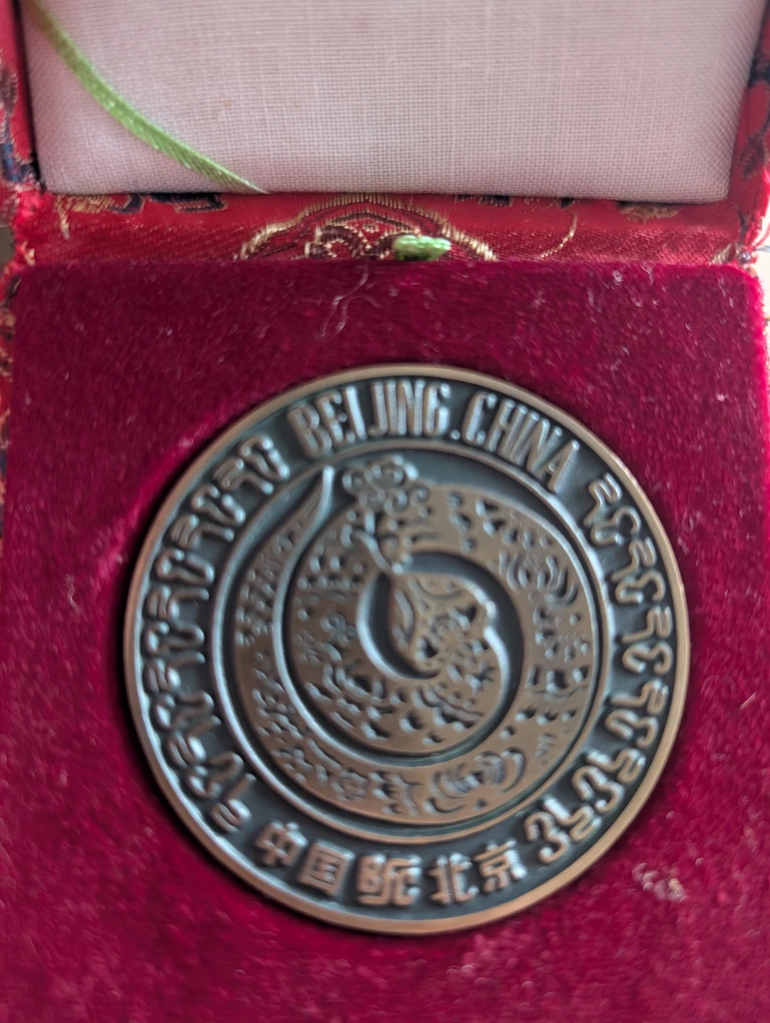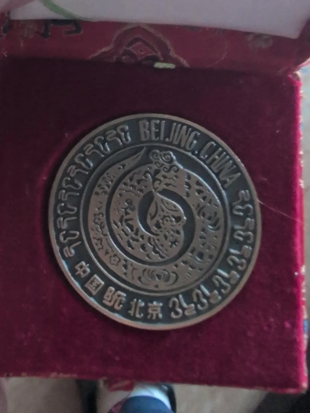 Commemorative Chinese Zodiac Medallion from Beijing, China. Features intricate detailing with a year of the dragon design. Comes in a velvet-lined presentation box and is covered in a satin silk brocade fabric featuring traditional Chinese patterns including blue and gold dragons, along with auspicious symbols and floral designs.