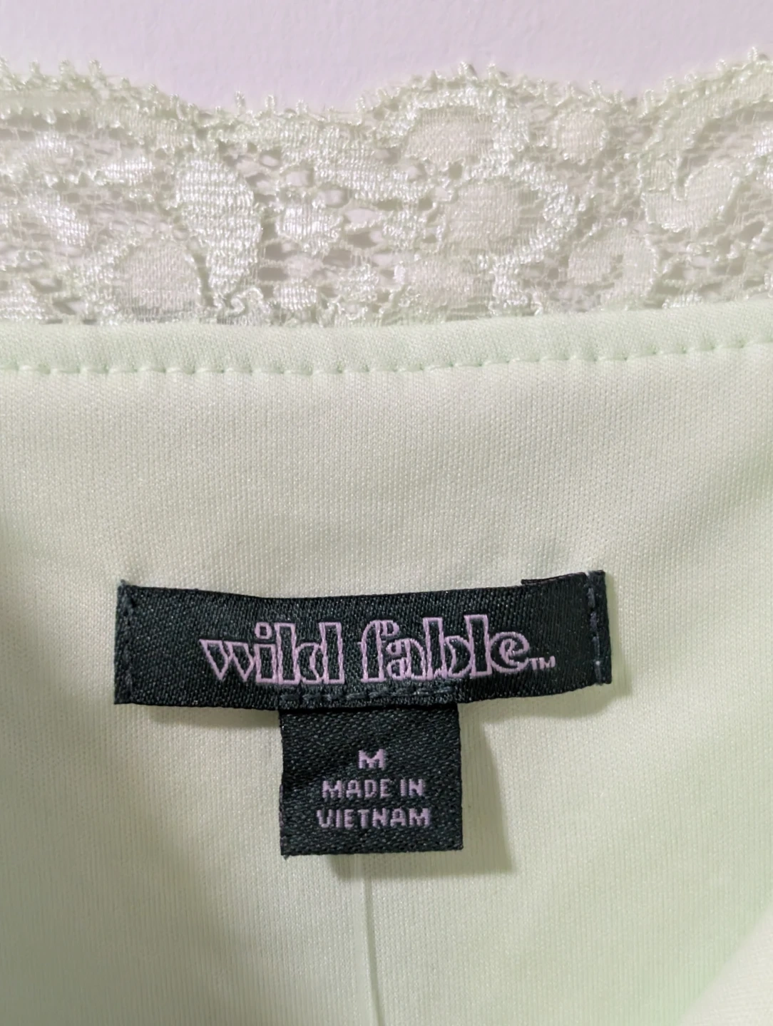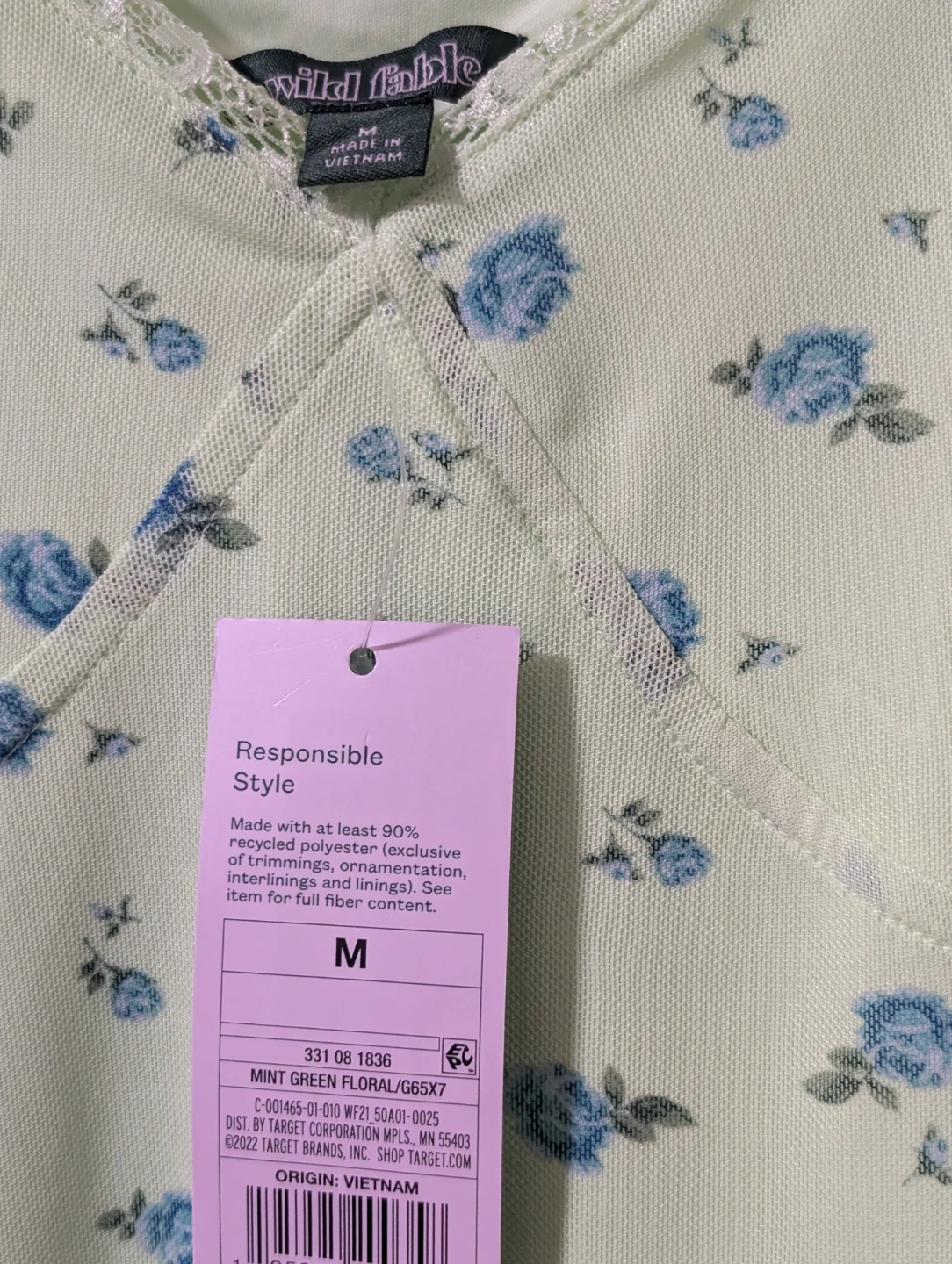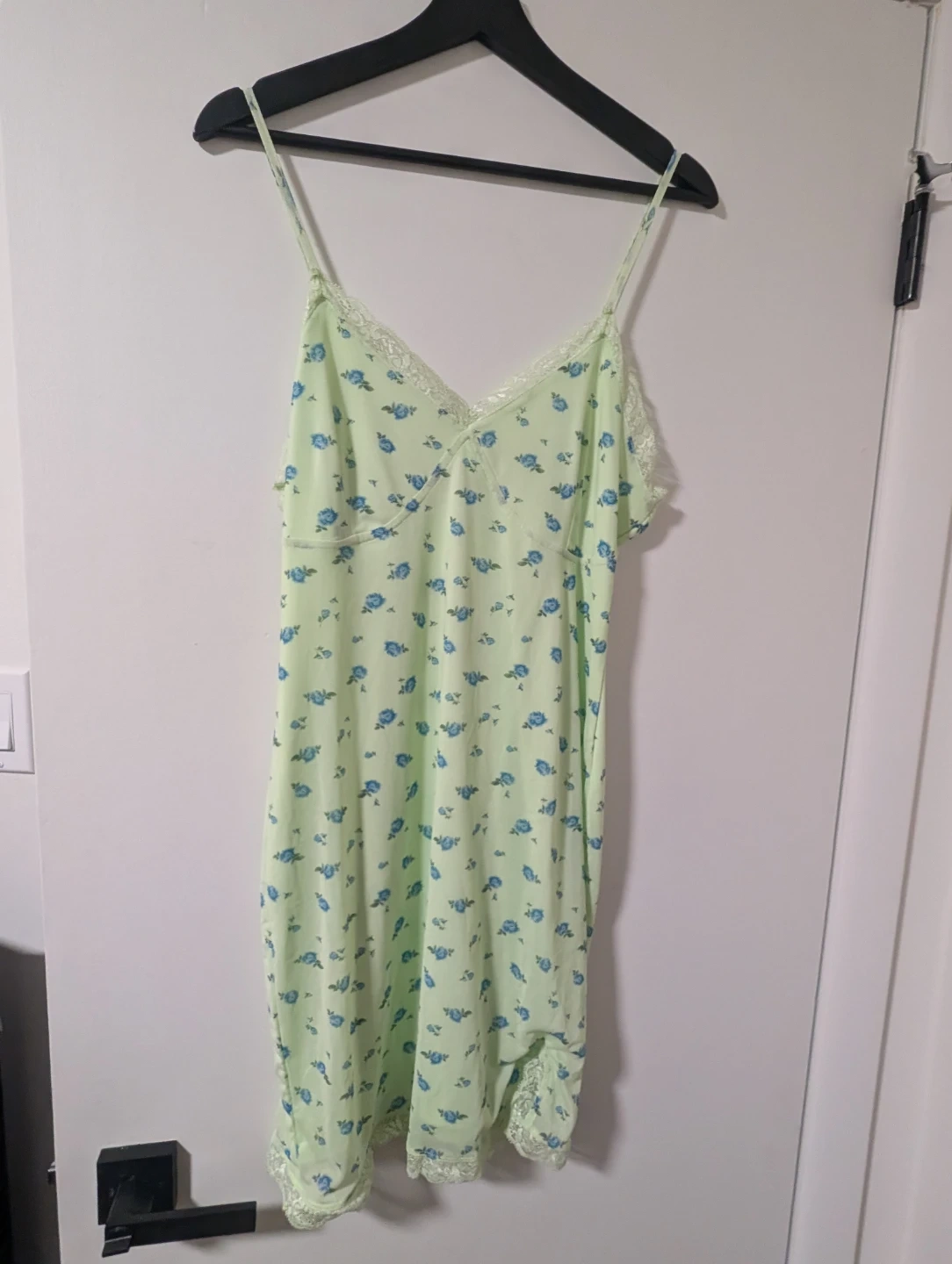 Wild Fable slip dress in a mint green colour with a floral pattern. It's size medium and features lace trim. Made with at least 90% recycled polyester.