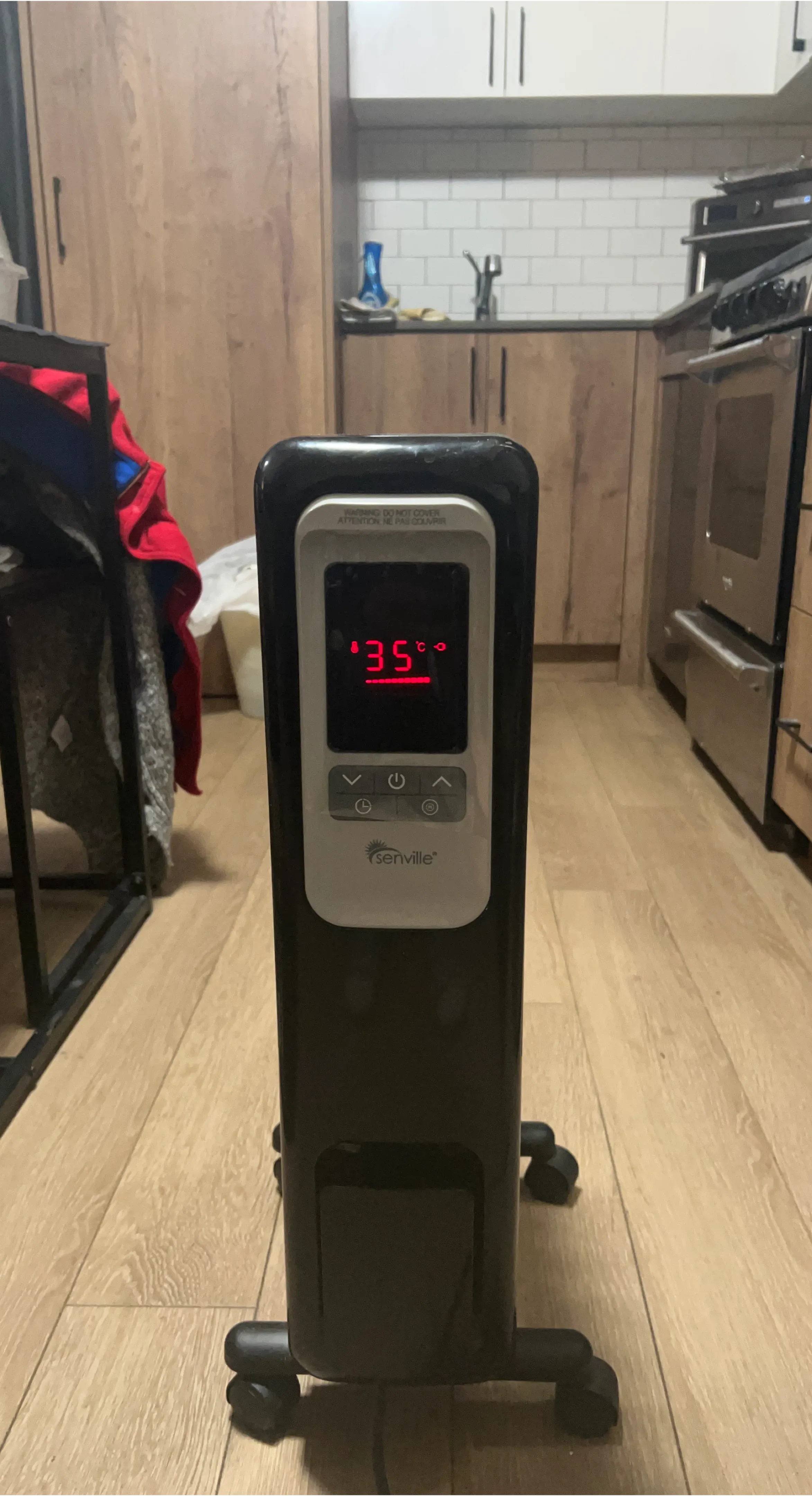 This is a Senville electric oil-filled radiator heater. It's black and comes with wheels for easy mobility. The digital display shows the current temperature.