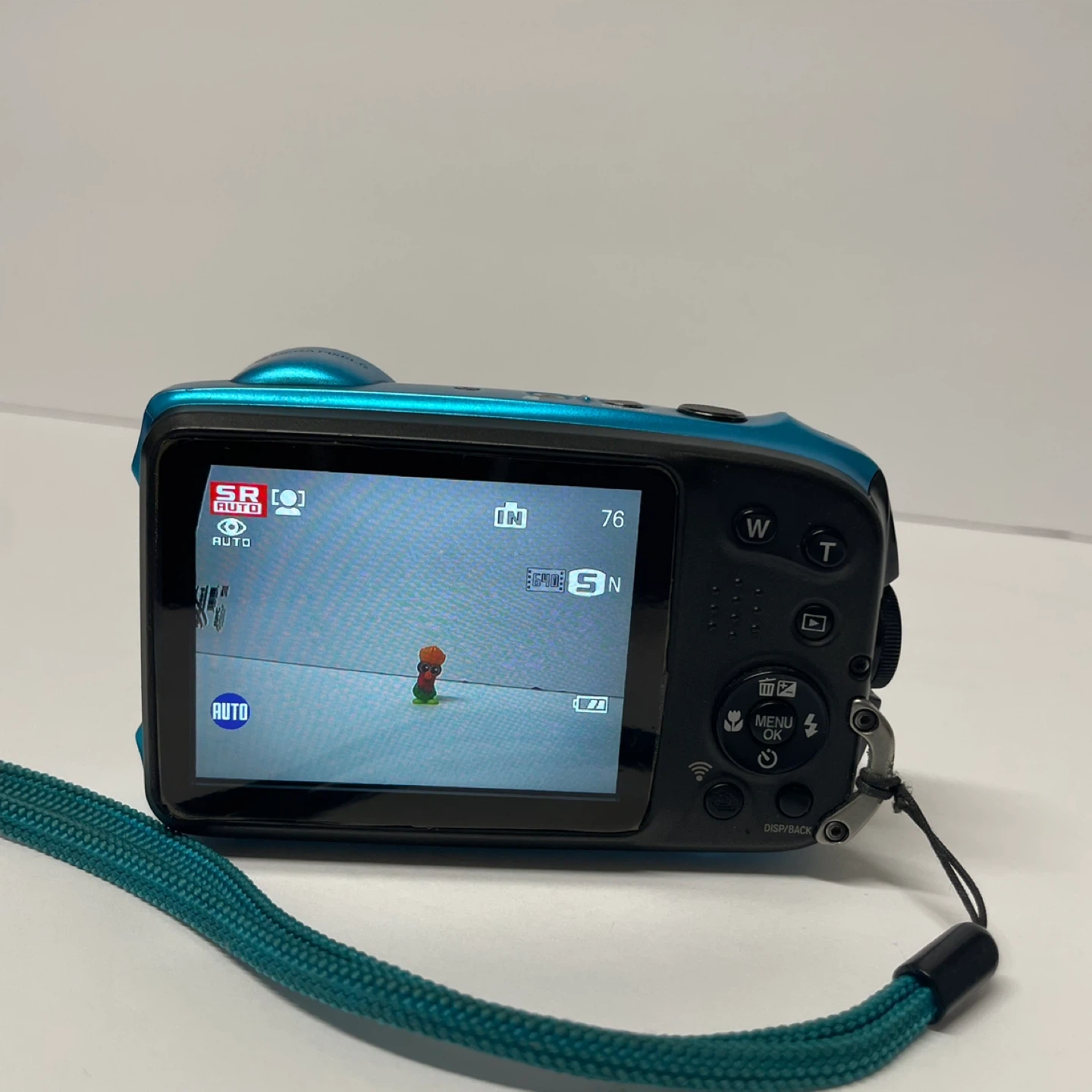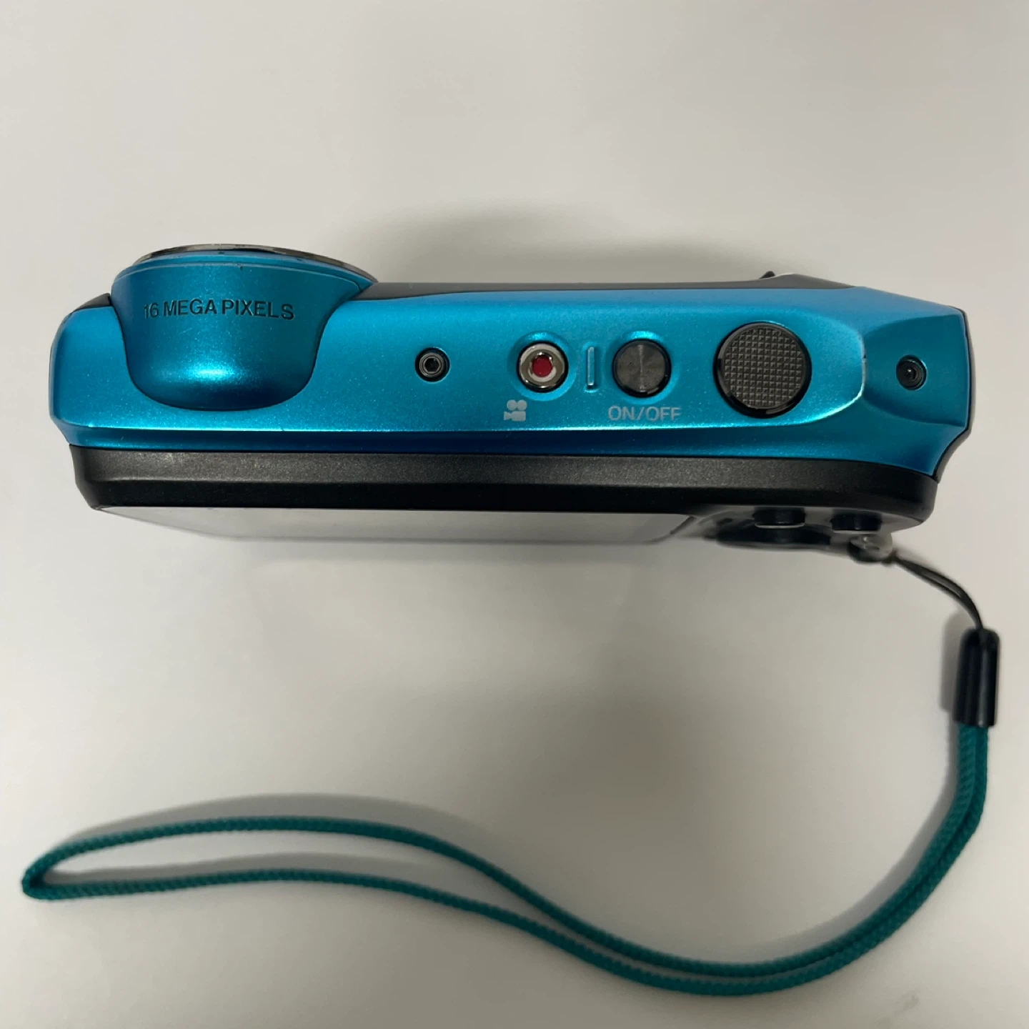 This Fujifilm digital camera is blue and waterproof up to 20m/65ft. It has a 16-megapixel sensor and 5x optical zoom. The camera is shockproof from 1.75m/5.8ft.