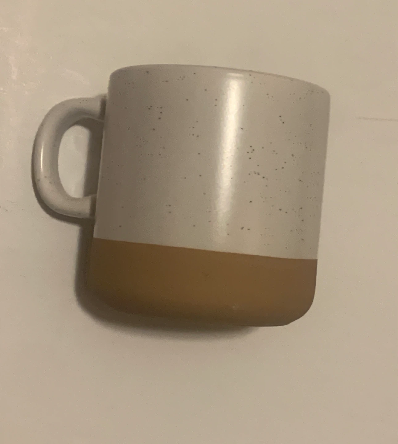 This is a simple two-tone ceramic mug. It has a speckled white upper half and a solid tan lower half. It's a standard mug size, perfect for your morning coffee or tea!