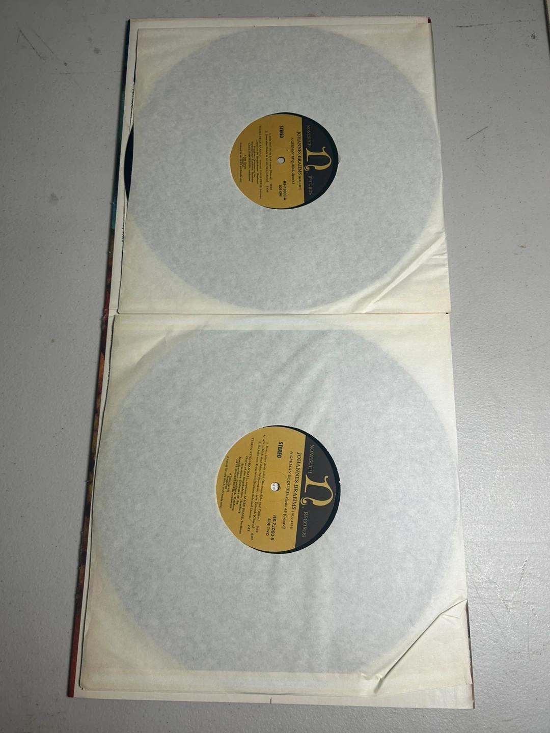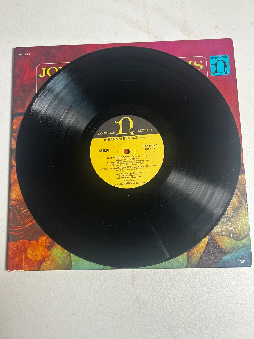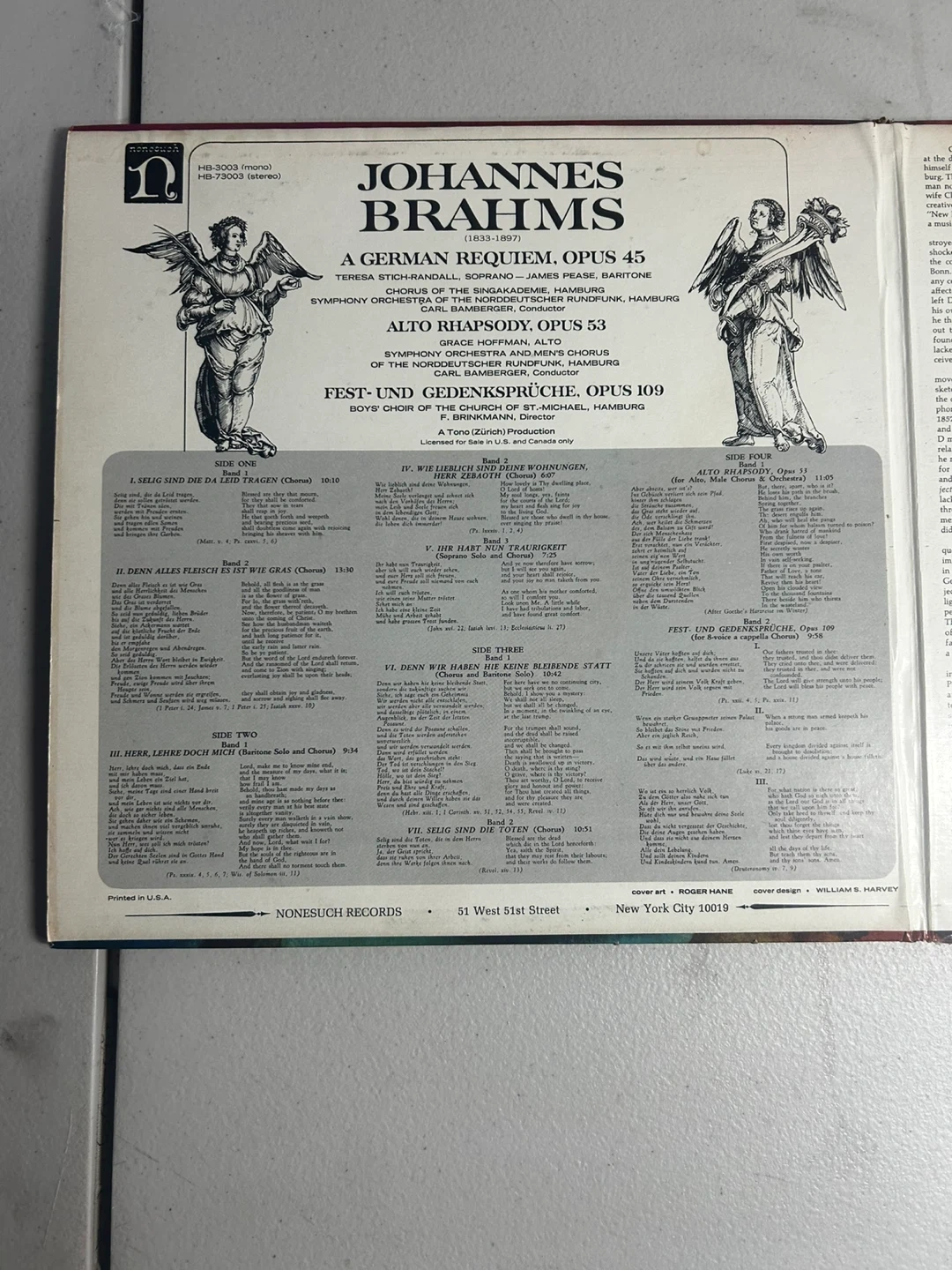 This Nonesuch Records vinyl features Johannes Brahms' A German Requiem, Opus 45, along with Alto Rhapsody, Opus 53 and Fest- und Gedenksprüche, Opus 109. Includes original liner notes with lyrics. A classic recording for any music enthusiast!