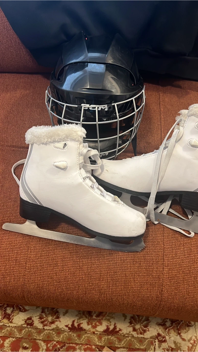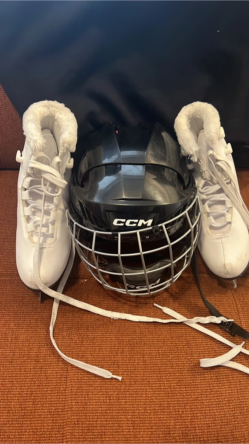 A pair of white figure skates with faux fur trim. Included is a black CCM hockey helmet.halmet is broken but still can be used.