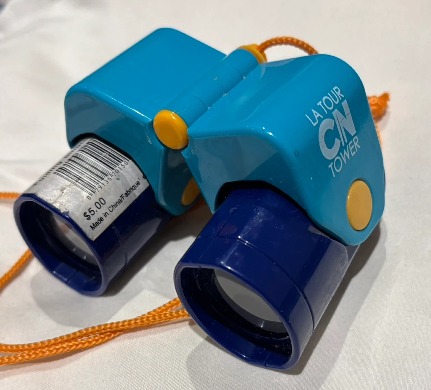 Blue and light blue folding binoculars with an orange lanyard. Features 'La Tour CN Tower' branding. These are great for kids who want to explore!.