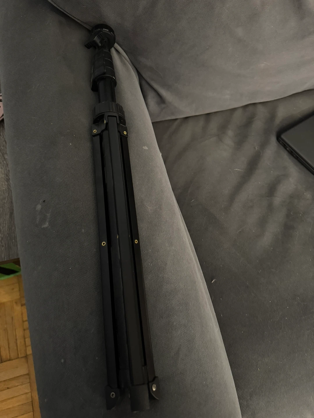 This is a black adjustable tripod. It's made of metal and plastic components. It's useful for stabilizing cameras or lights for photography or videography.