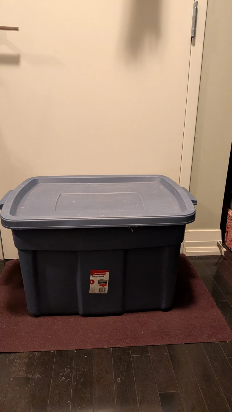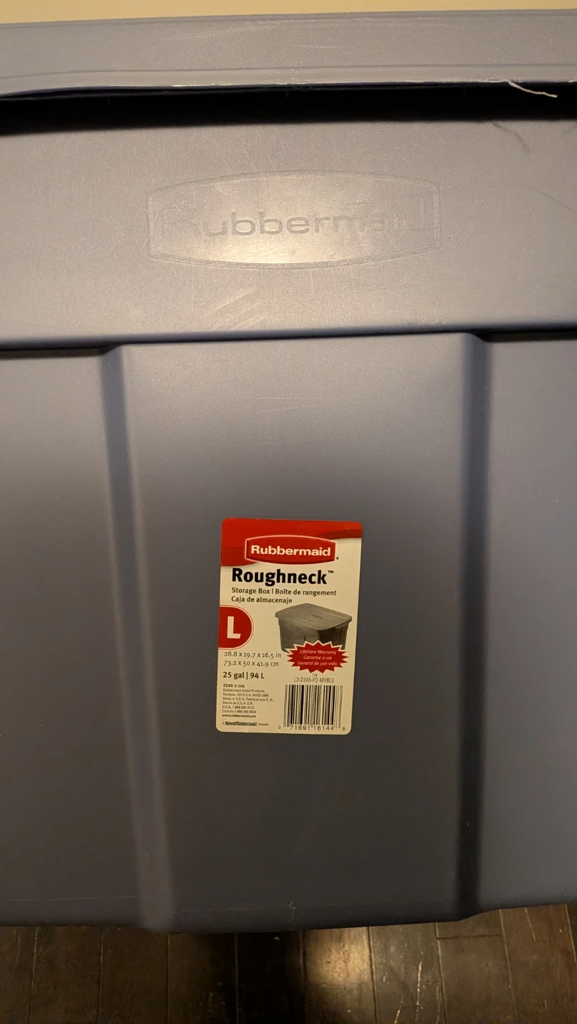 A Rubbermaid Roughneck storage box. It's a size L with 25 gallons capacity. Dimensions are 28.8 x 19.7 x 16.5 inches.