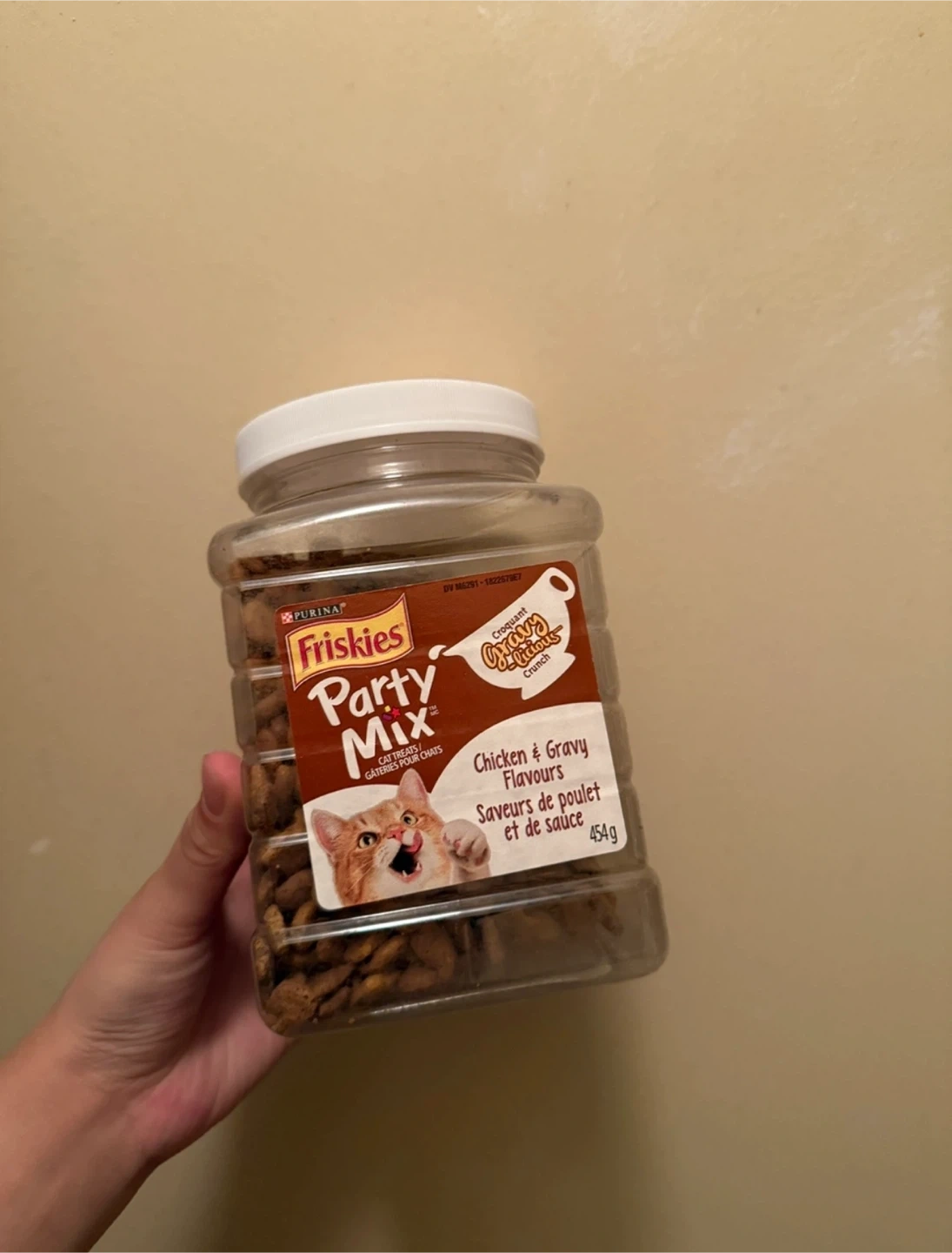 This is a large container of Purina Friskies Party Mix cat treats. It features Chicken & Gravy Flavours and a Crunchy & Creamy finish. Best by September 2024. 454g.