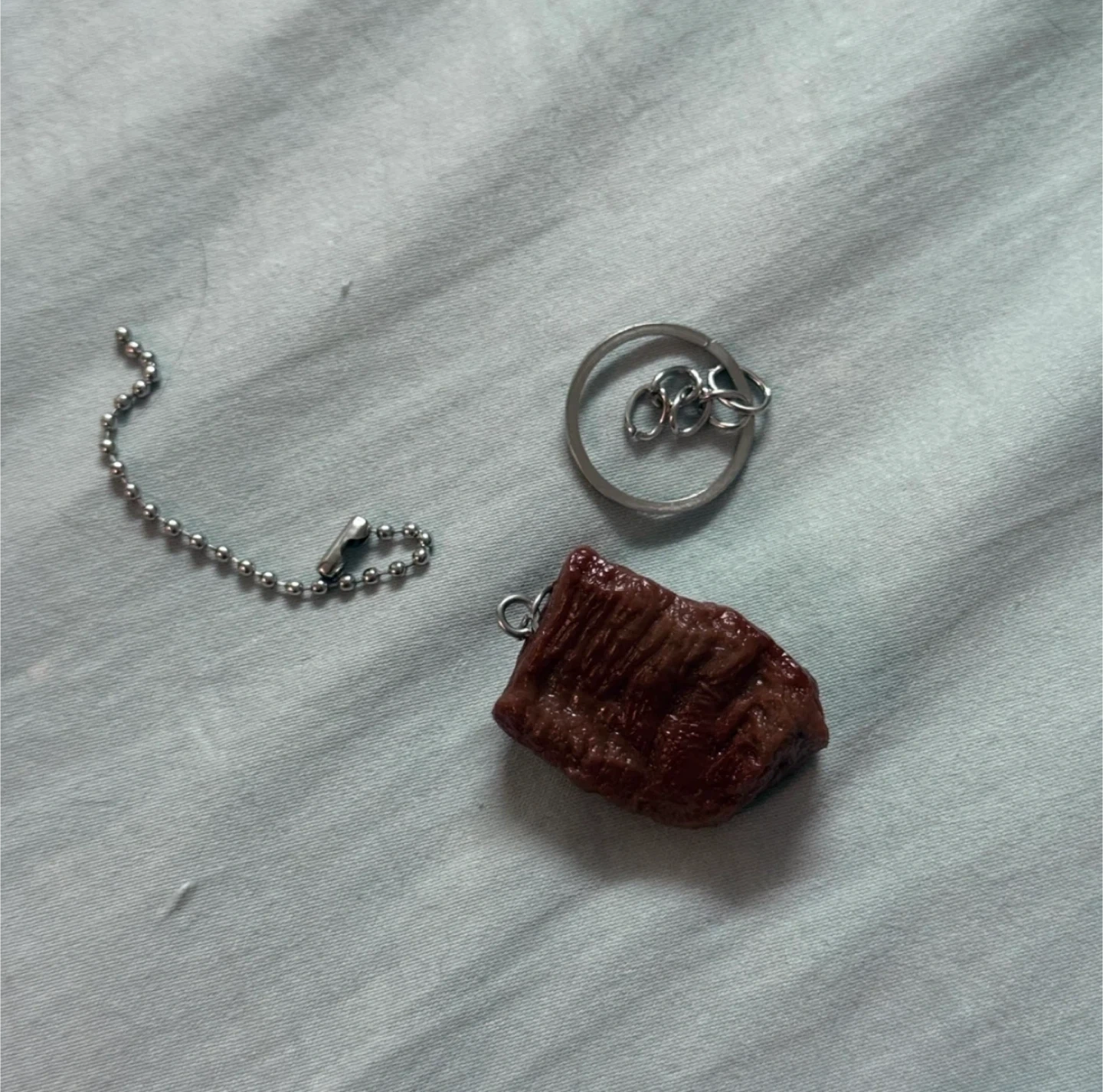 Realistic steak-shaped charm on a keychain. Includes a ball chain and a separate keyring attachment. Makes a fun accessory!