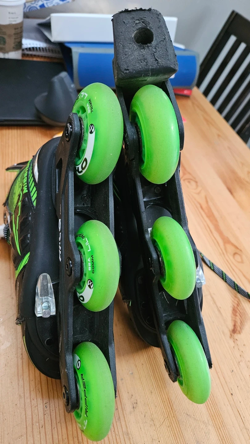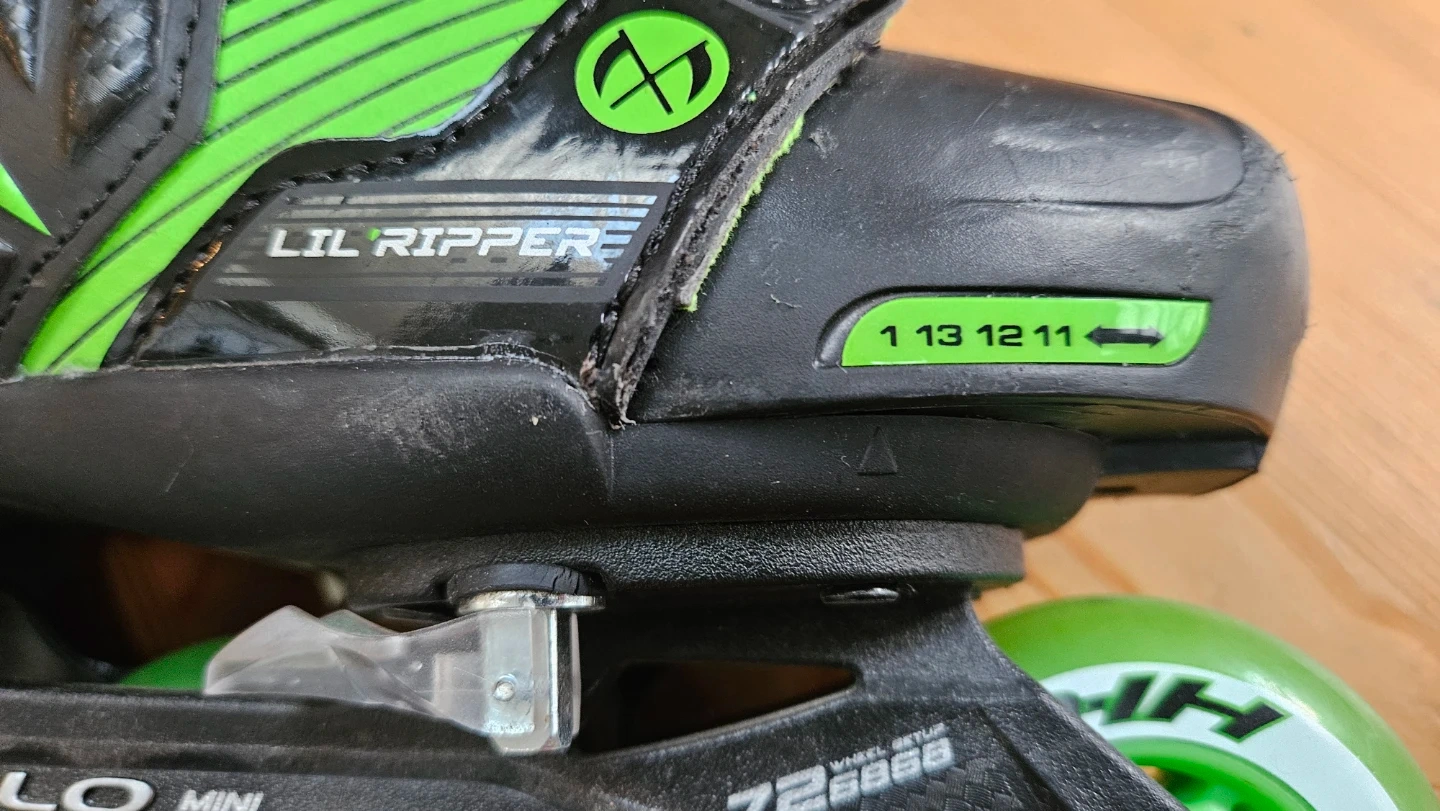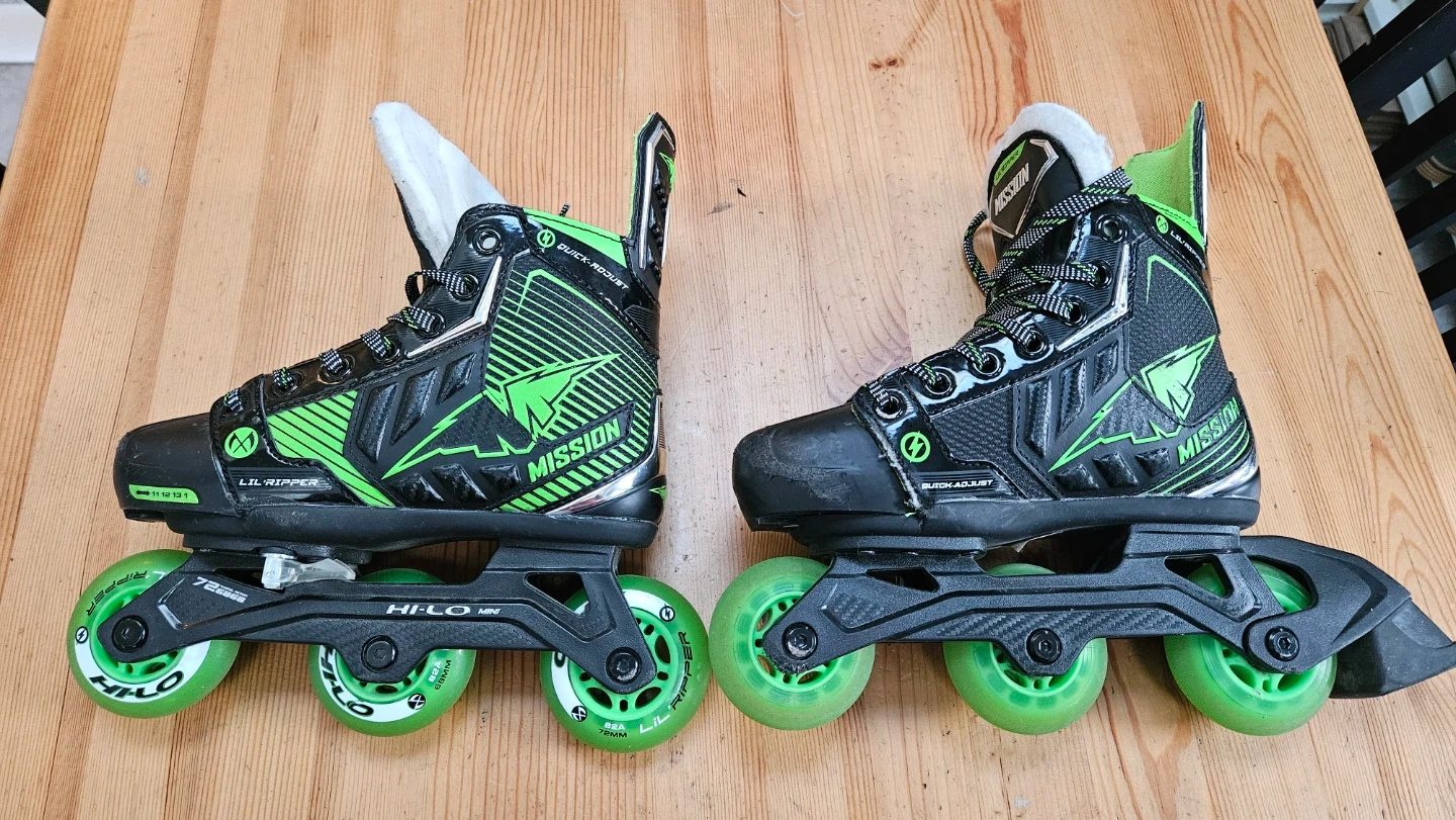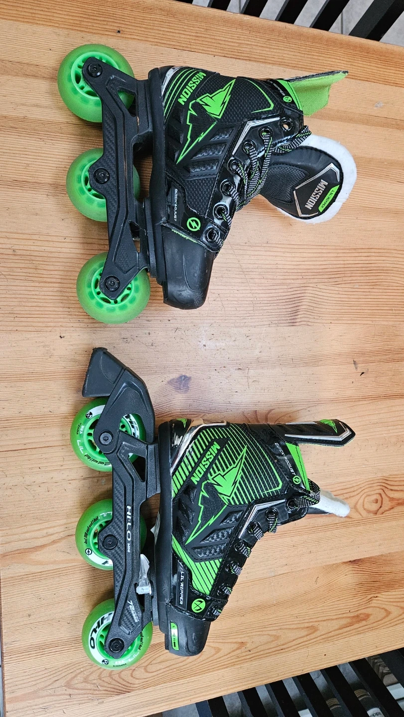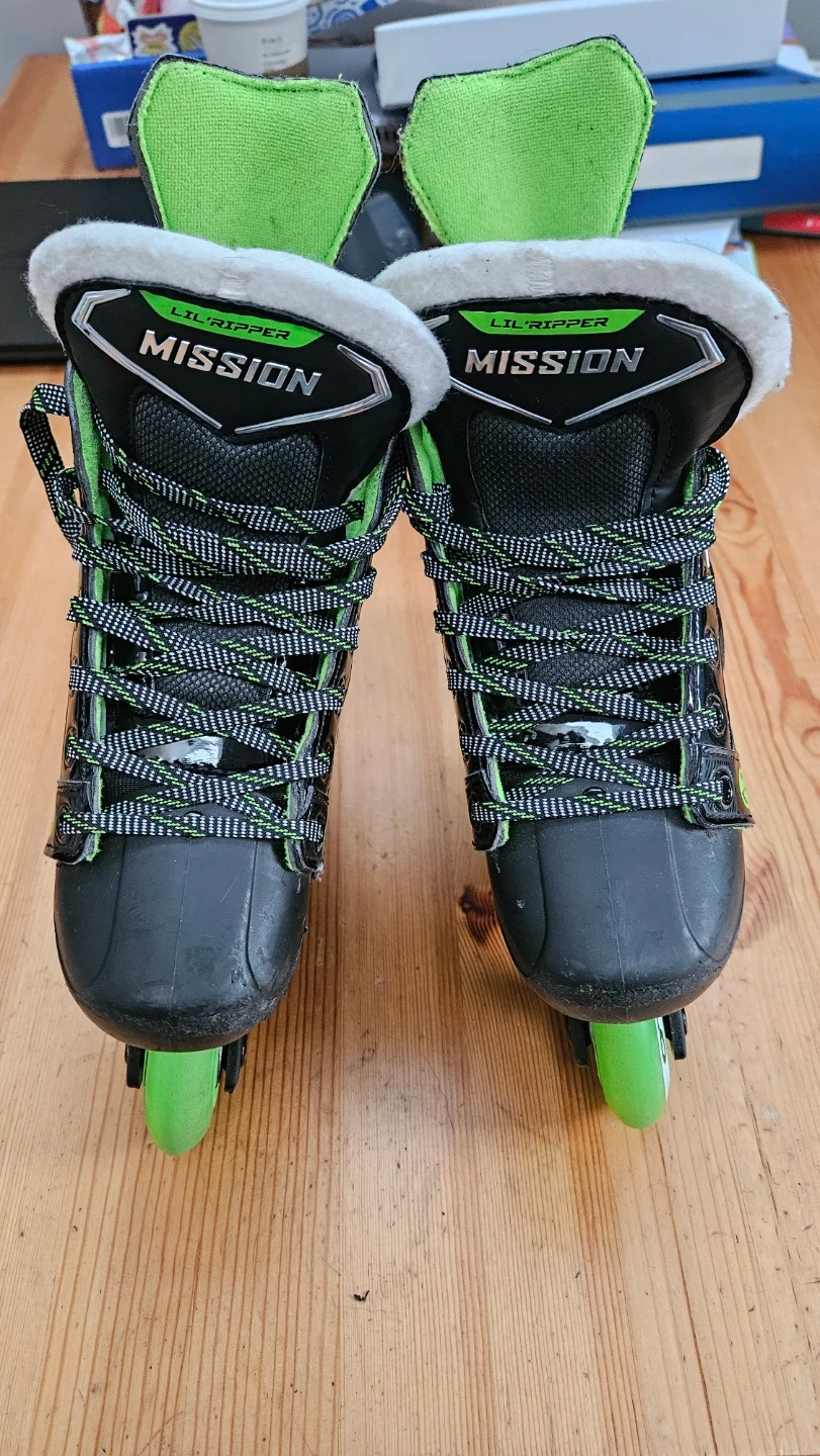 These Mission Lil Ripper inline skates are black and green. They have a soft boot and adjustable sizing for kids. The wheels are 68mm. Use a few times so lots of life left.
