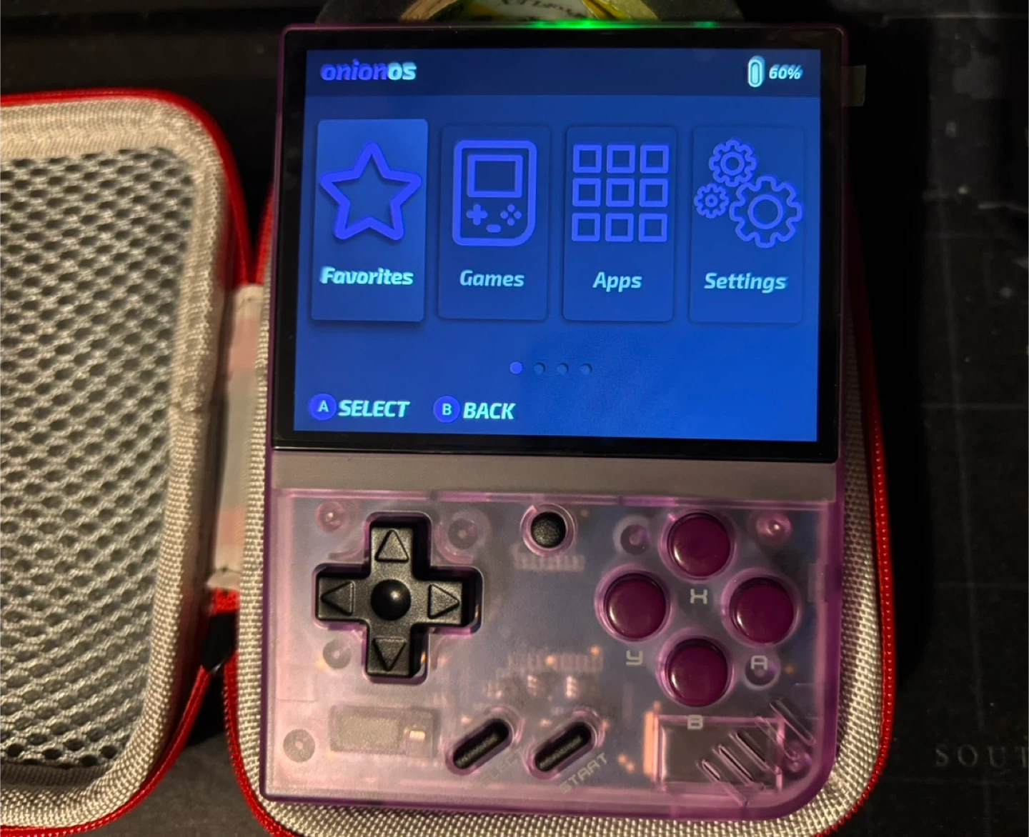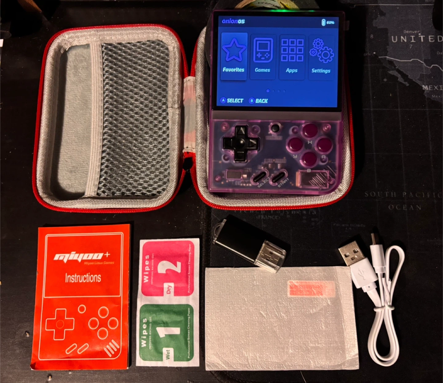 Selling a Miyoo Mini+ handheld game console in Transparent Purple,comes with carry case and accessories, including instructions 64GB SD Card with over 17,000 games in it, USB-c cord for charging, usb adaptor for sd card and screen protector.
