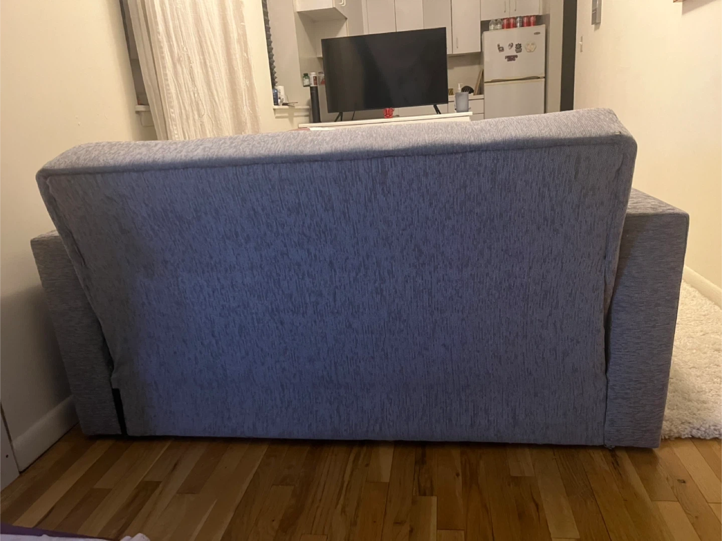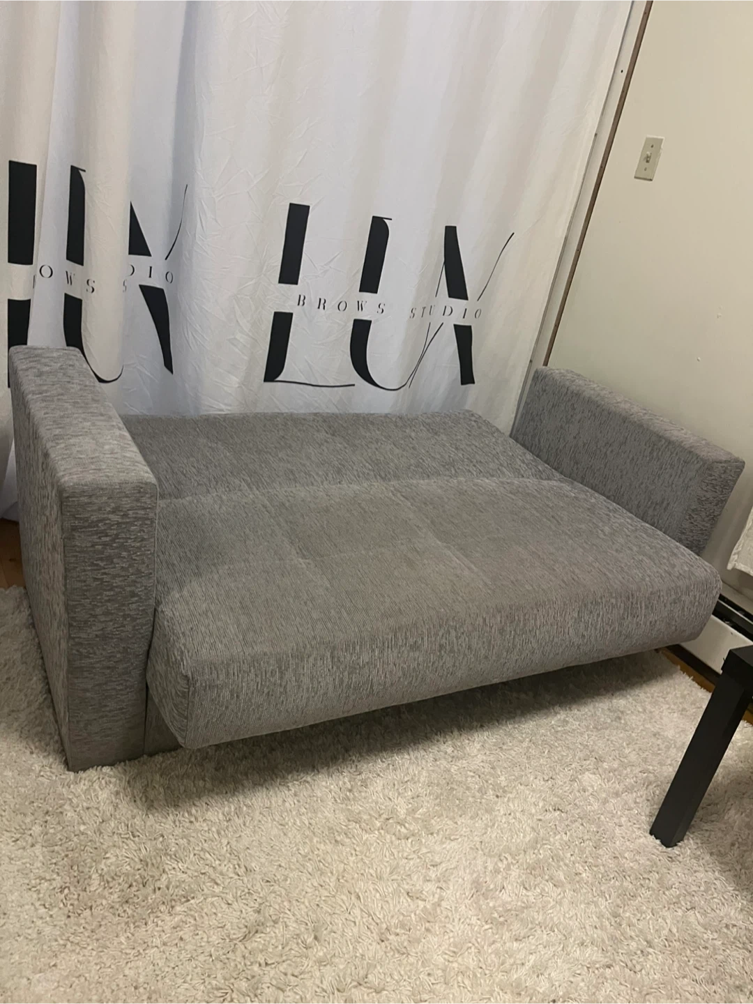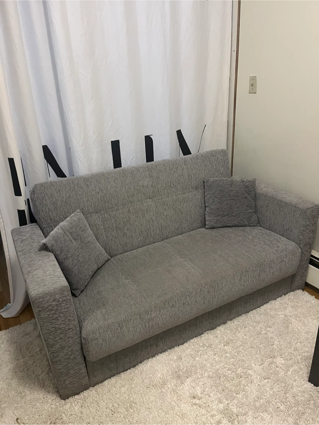 This grey sofa is upholstered in a textured fabric. It includes two matching throw pillows. It can be converted into a bed.