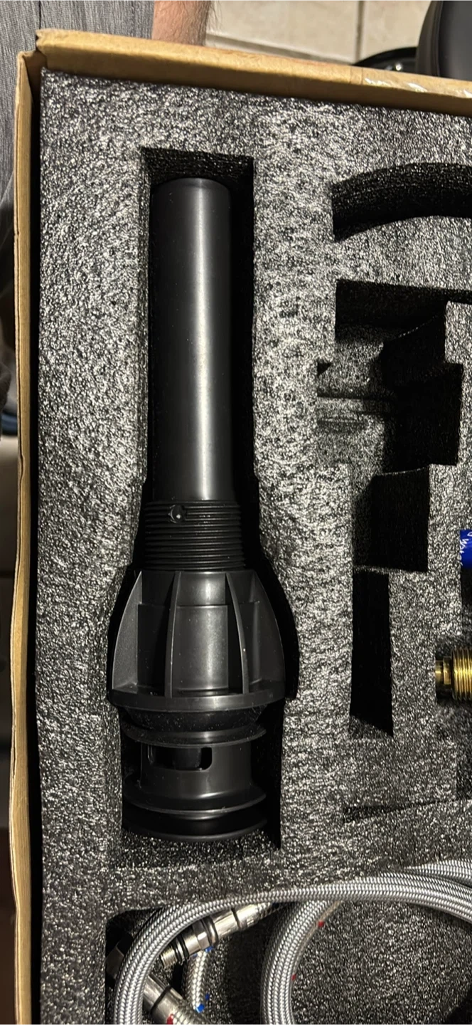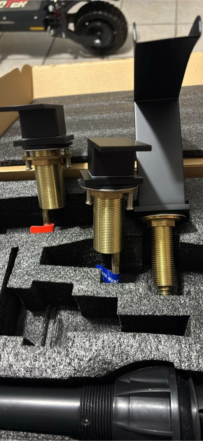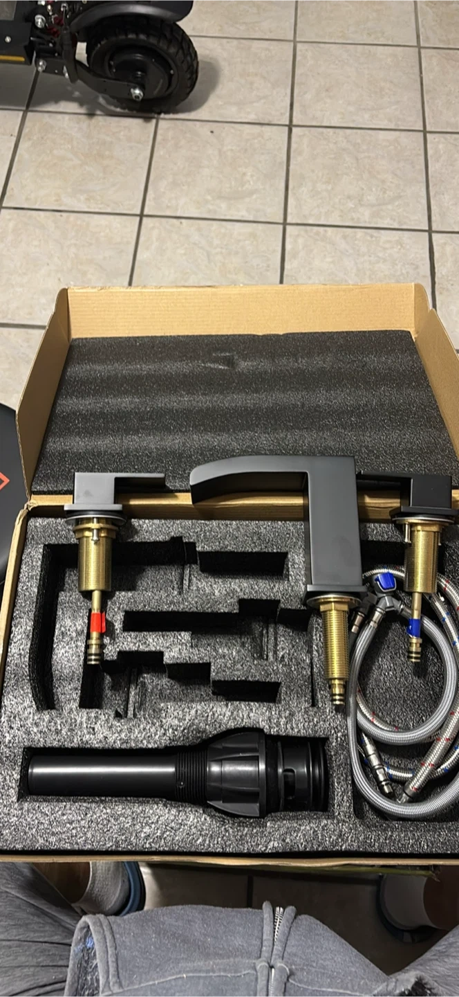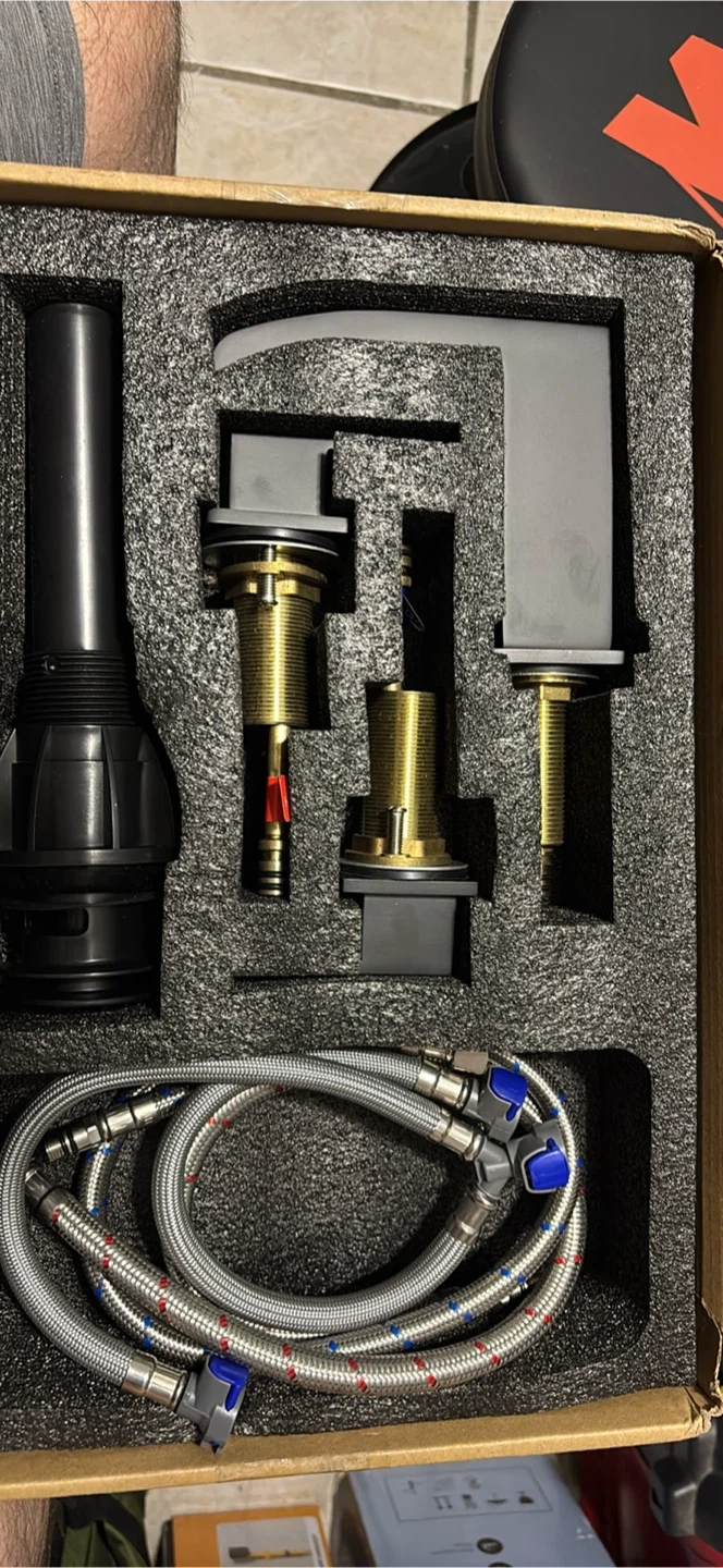 This is a new black waterfall faucet set, complete with hot and cold water hoses. It's made of durable brass and features a sleek, modern design. This faucet set is perfect for updating any bathroom or vanity.