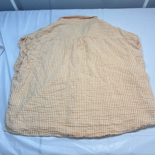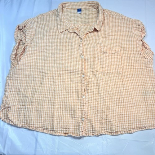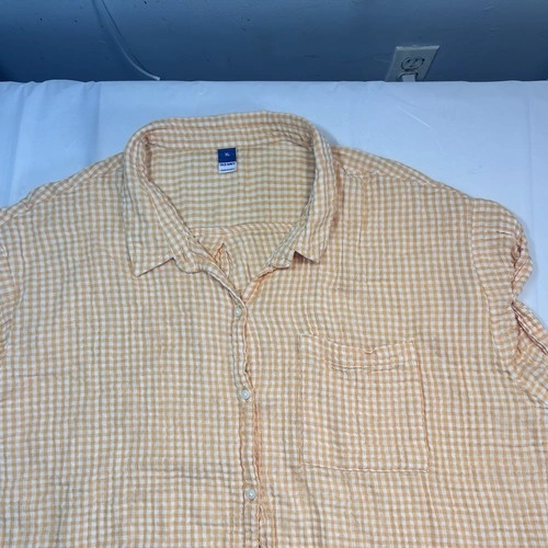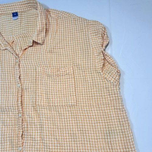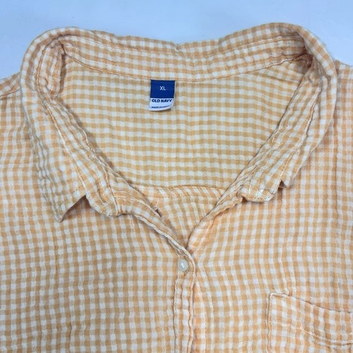 The Old Navy XL Orange and White Gingham Button-down Shirt is a versatile and classic piece made from 100% cotton. This stylish button-up shirt is perfect for casual occasions, featuring a charming orange color and a comfortable size XL. The shirt is buttoned up with a classic design, making it a great addition to your summer, fall, or spring wardrobe. With its timeless style, basic design, and gingham pattern, this shirt is a must-have for women seeking a wardrobe staple that is both trendy and comfortable.