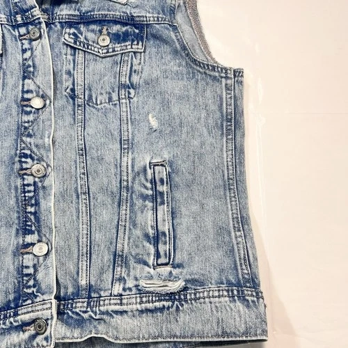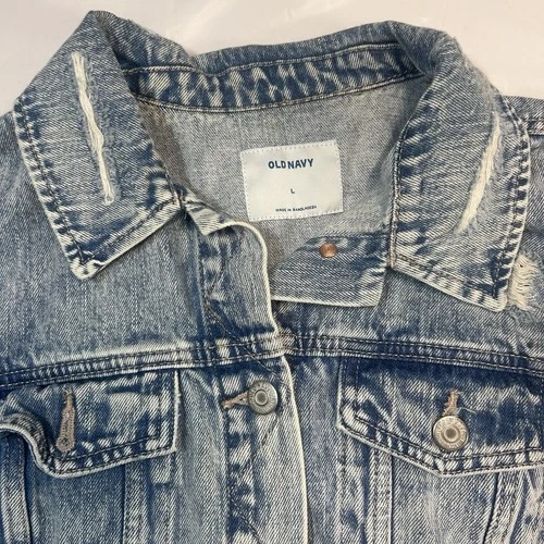 This Old Navy denim jacket in size L for women is a stylish and versatile outerwear piece made from cotton denim fabric. This short-length jacket features a button closure and a regular fit, perfect for casual occasions in the winter, fall, and spring seasons. With its classic blue color and basic jacket style, this piece is easy to care for with machine washable instructions. The jacket is not vintage and is not handmade.