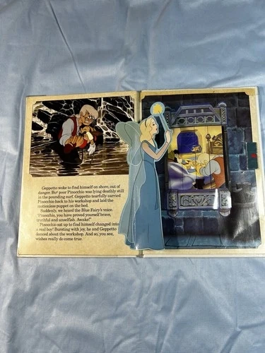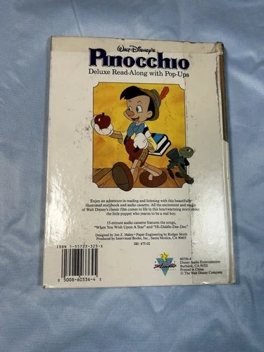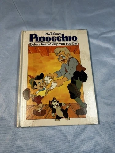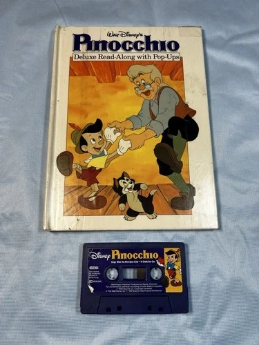 This is a vintage Walt Disney's Pinocchio Deluxe Read-along book with pop-ups and a cassette. It features story panels with pop-up elements that bring the story to life as you read along. The cassette allows you to listen to the story while following the pop-up panels, creating an immersive reading experience. Perfect for collectors or those looking to revisit a classic Disney tale.