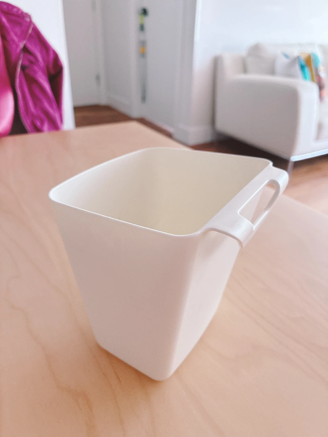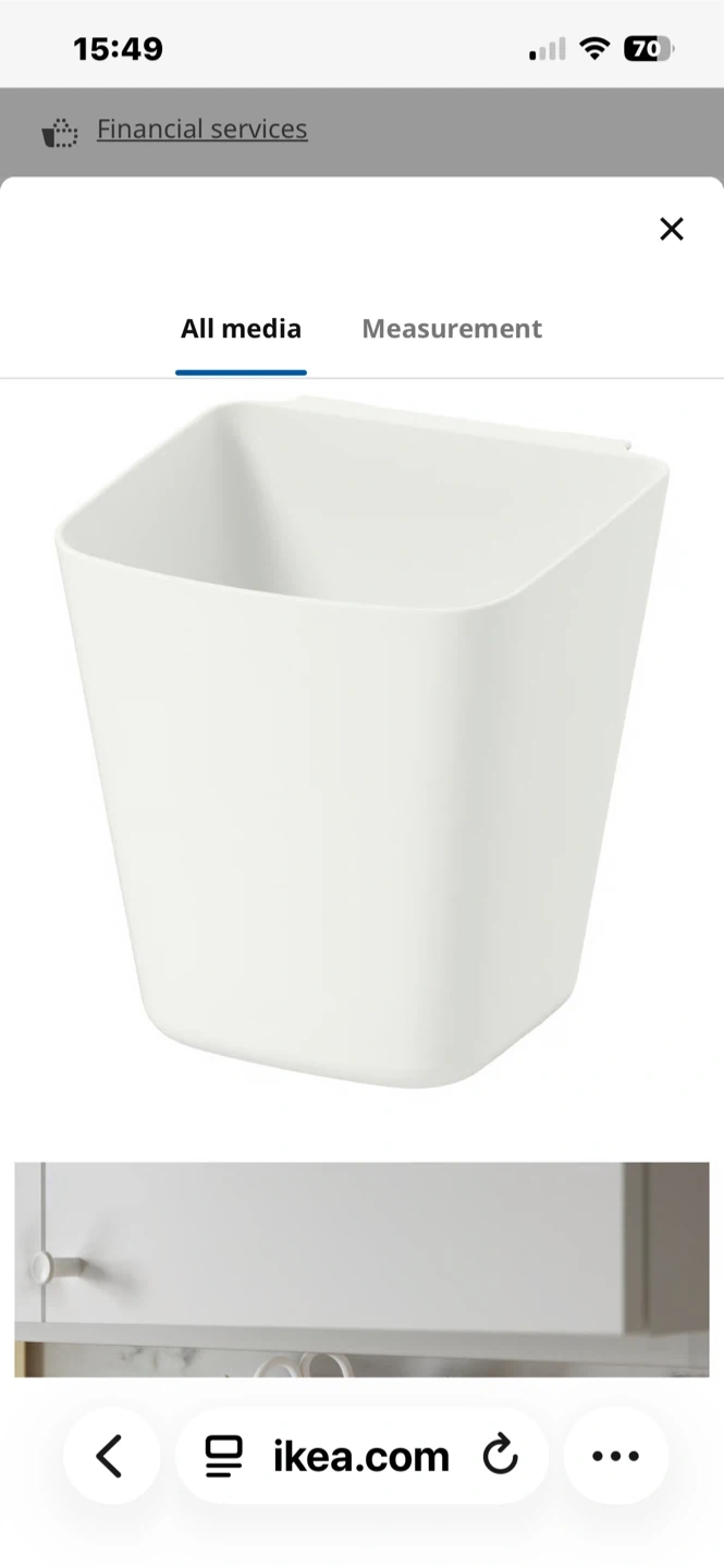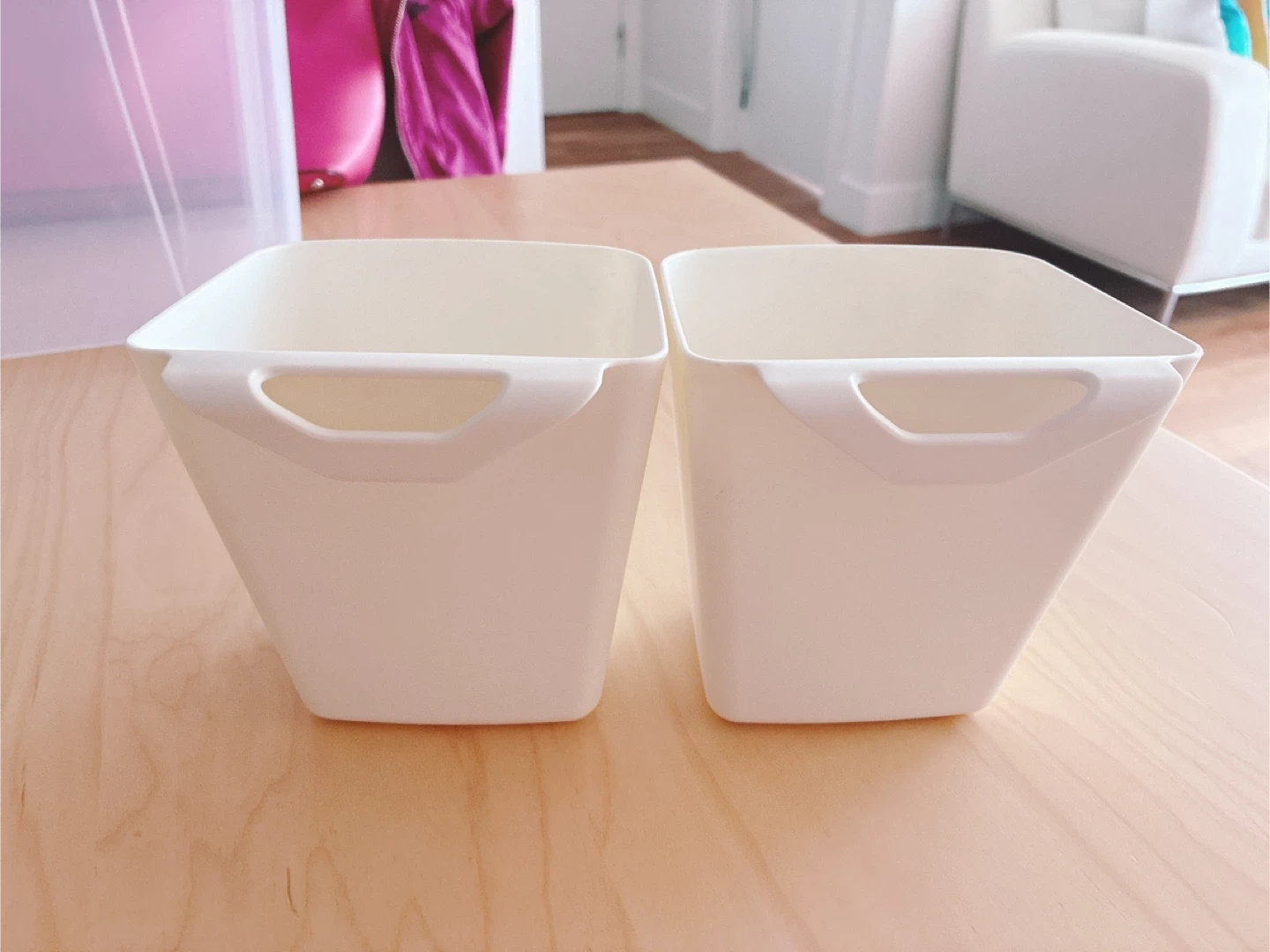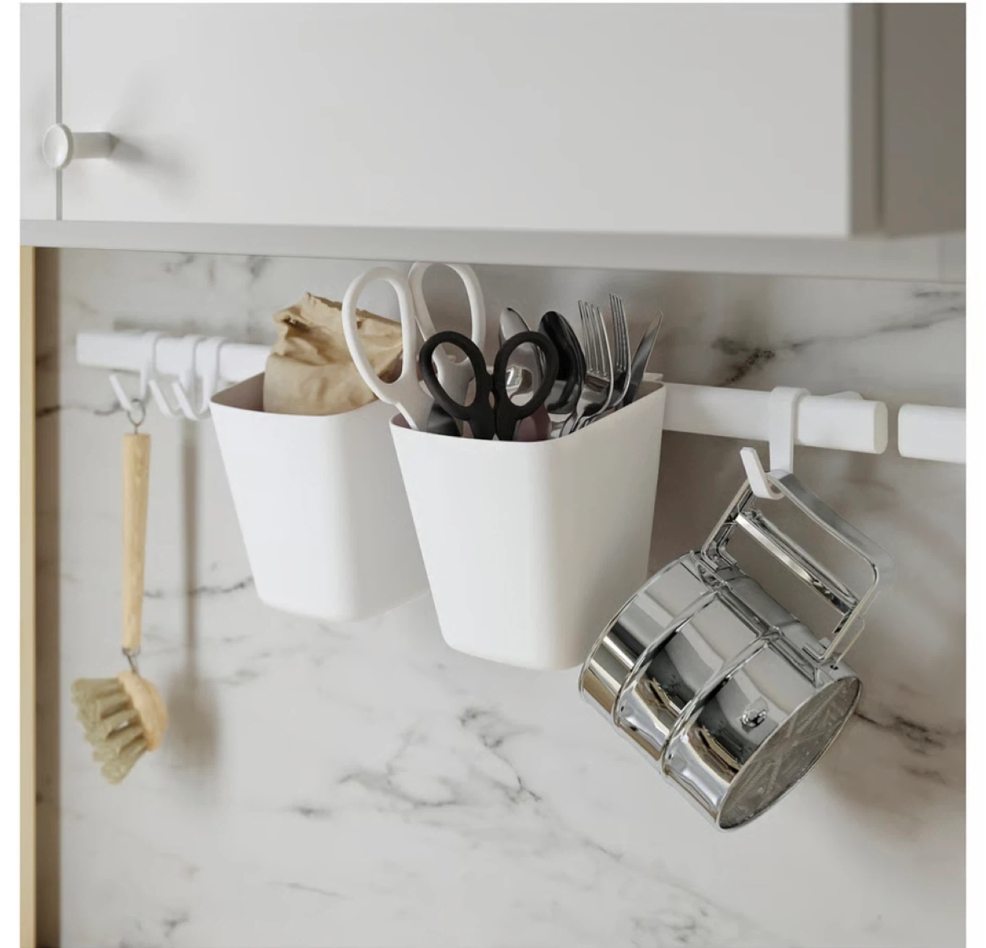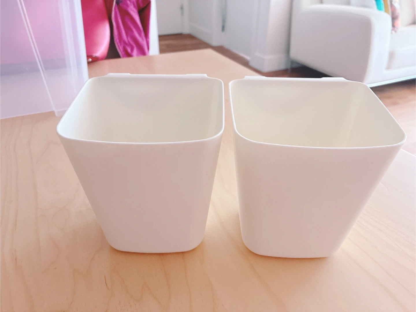 Two white plastic bins designed to hang from a rail. They're great for organizing small items in the kitchen or craft room. They have built-in handles for easy carrying. White plastic material.