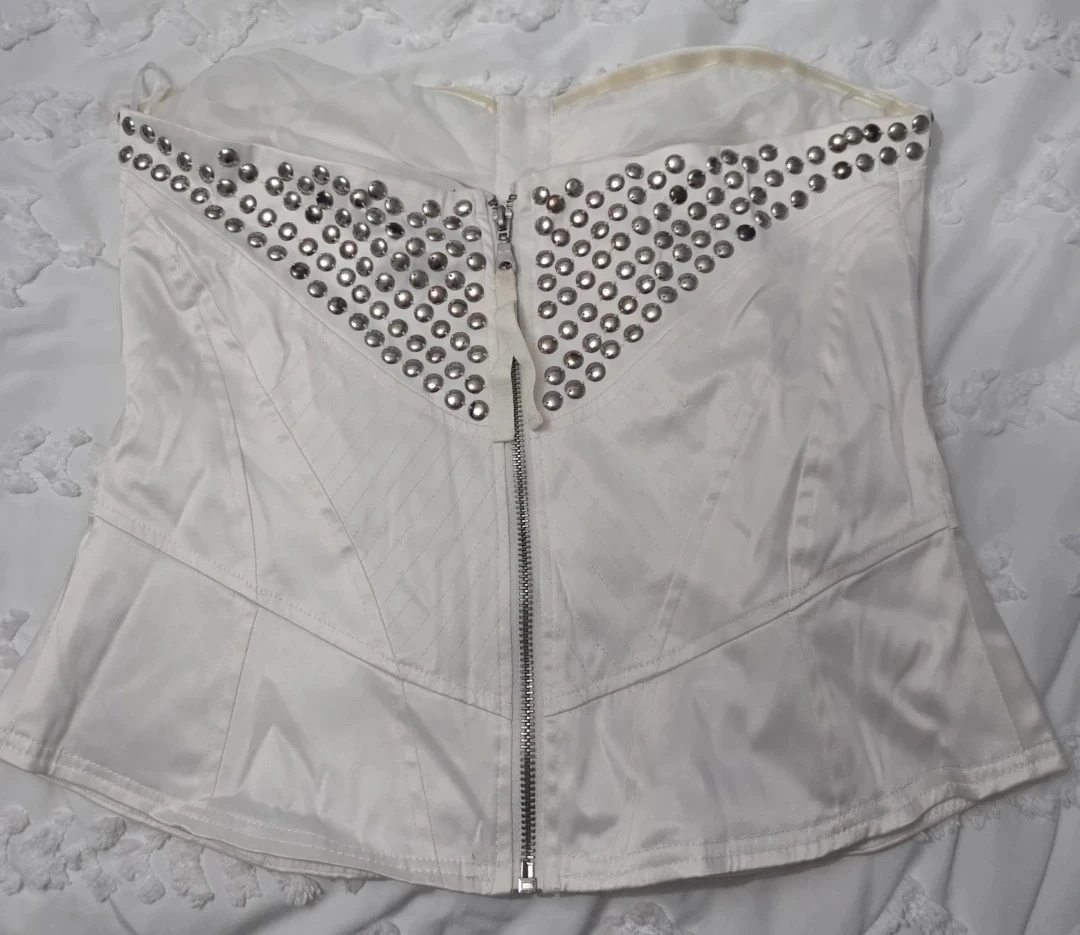 This white corset top features a satin-like material and silver stud detailing along the bust and front zipper. It has a peplum hem and a zippered back closure. This piece adds a bit of edge to any outfit!