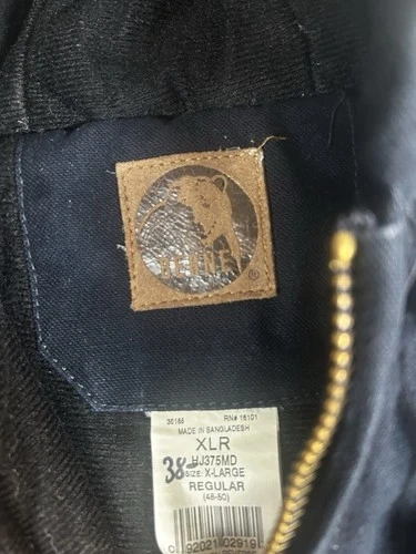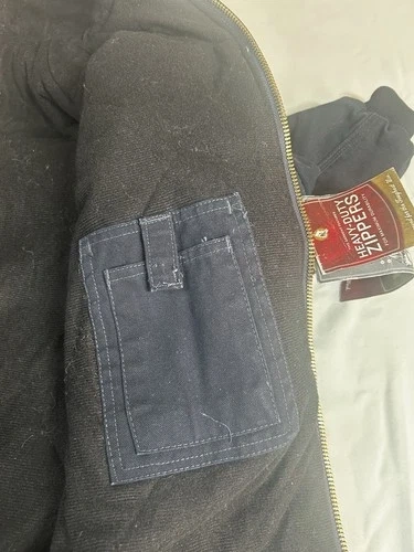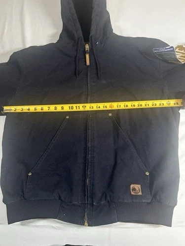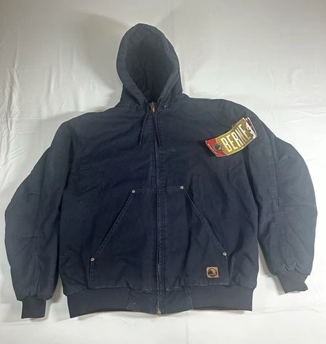 This is a dark blue cotton Berne jacket for men in size XL. It's designed for a hard-working style and features multiple pockets inside the chest for added functionality. A durable and practical outerwear option.