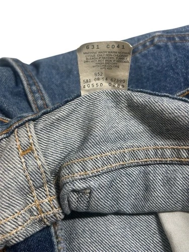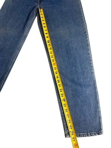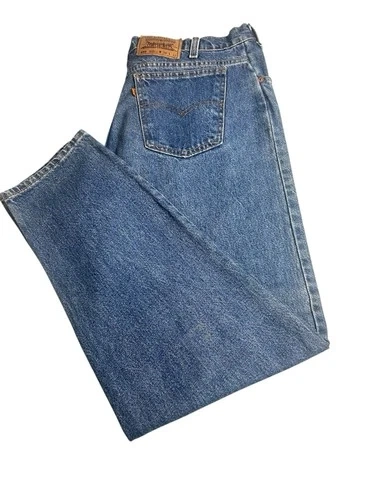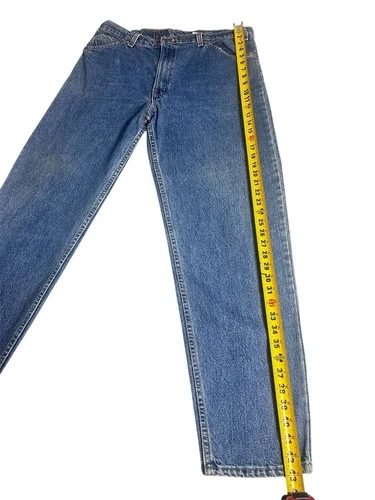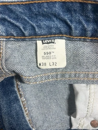 Pair of Levi’s 550 vintage jeans for men with an orange tag, made in the USA. These jeans feature a classic blue color with a medium wash, crafted from cotton denim fabric. They have a zip closure and a 5-pocket design, with a tapered style and a 32-inch inseam. The Levi's brand ensures quality and a timeless American theme, perfect for men looking for a piece of iconic denim history.