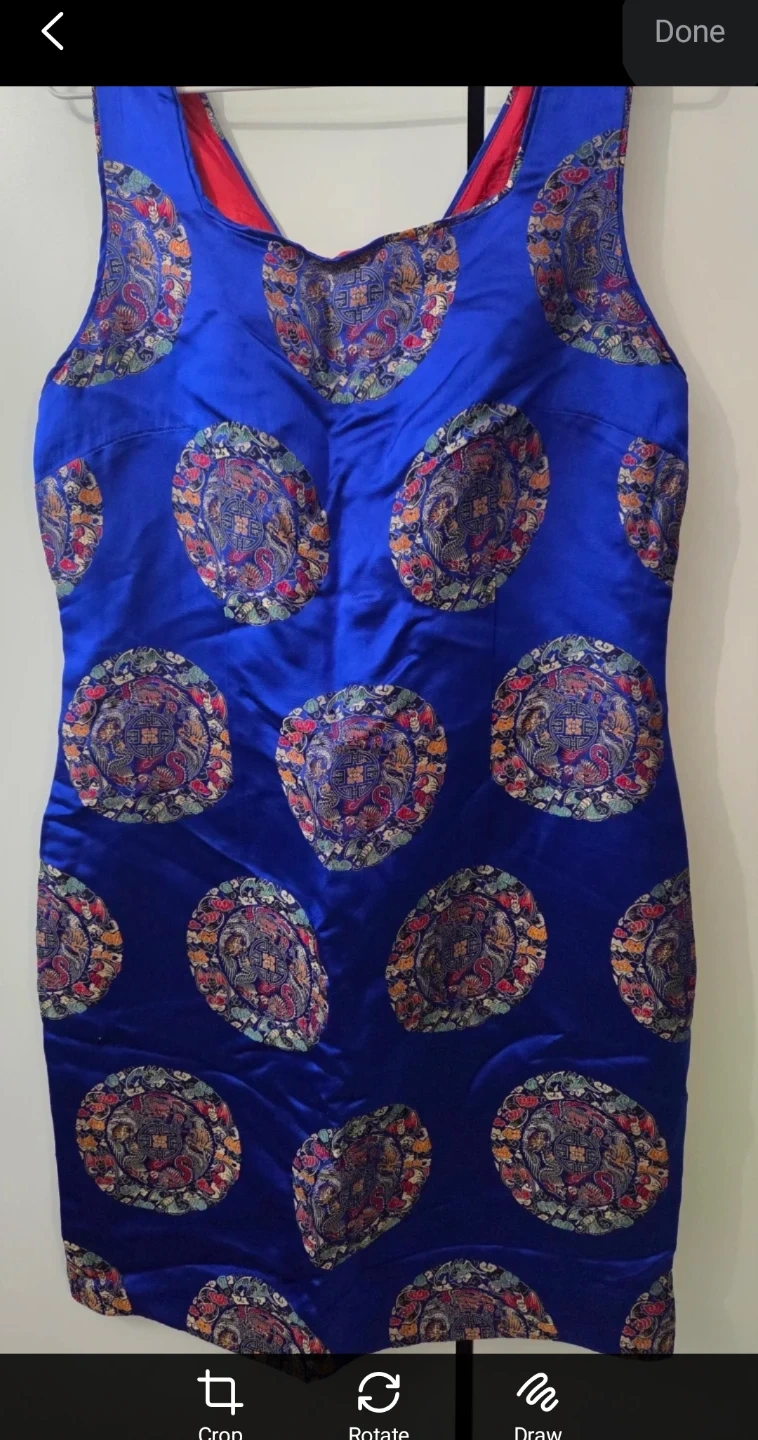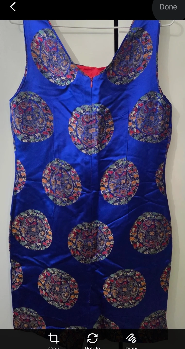 A beautiful blue sleeveless dress featuring a repeating circular brocade pattern. It has a red lining and a classic silhouette. The material appears to be a satin blend, offering a slight sheen.