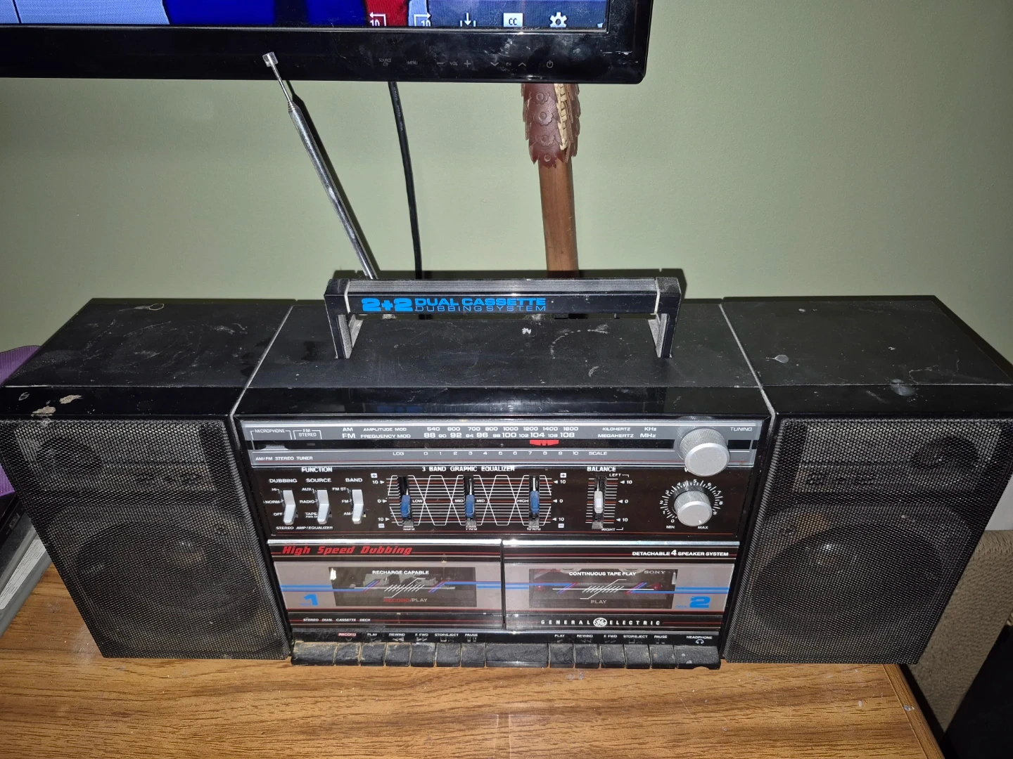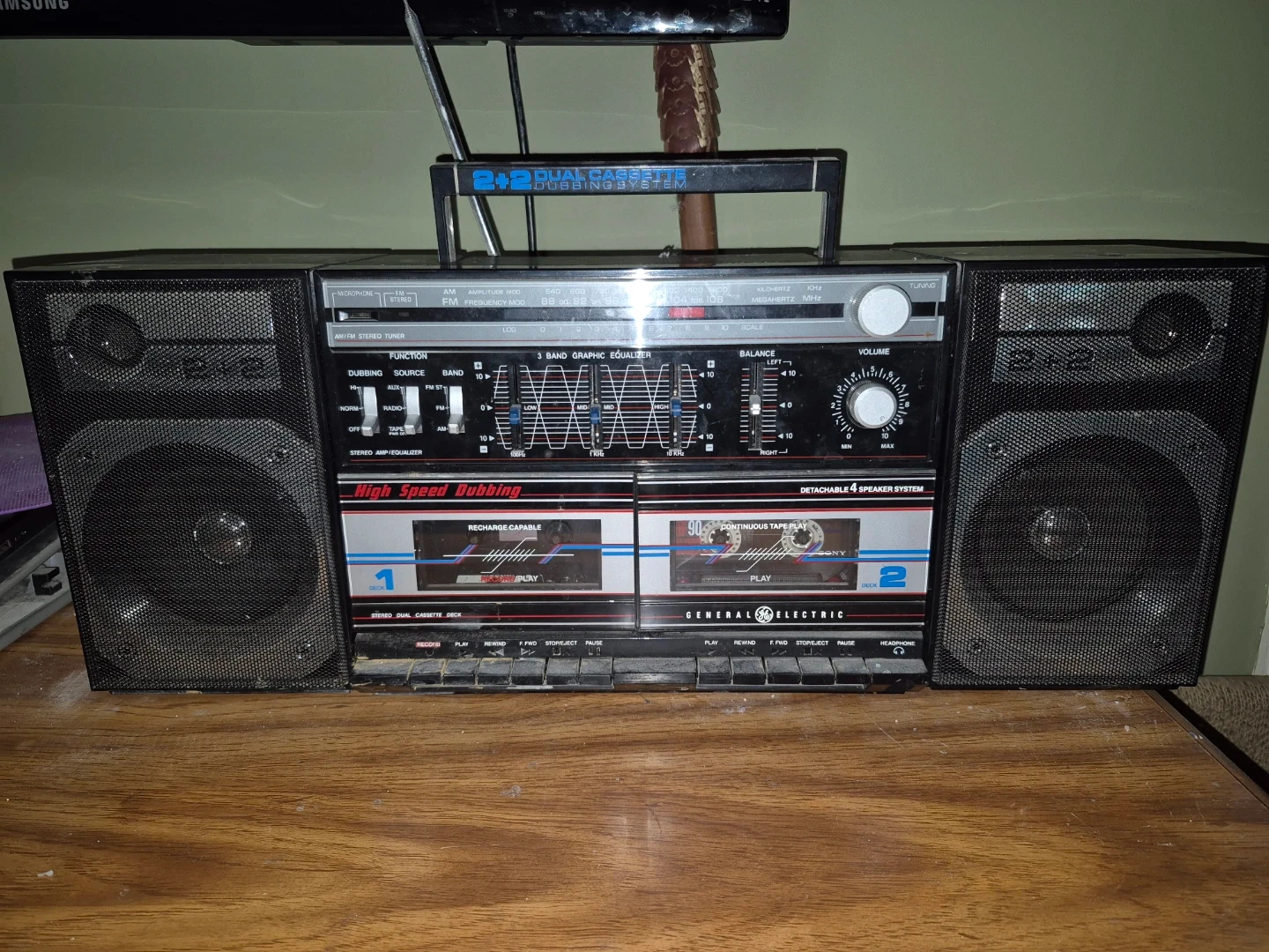 Classic GE boombox featuring a dual cassette deck with high-speed dubbing capabilities and AM/FM radio. It also includes a 5-band graphic equalizer and detachable speaker system for versatile sound. This unit is rechargeable.