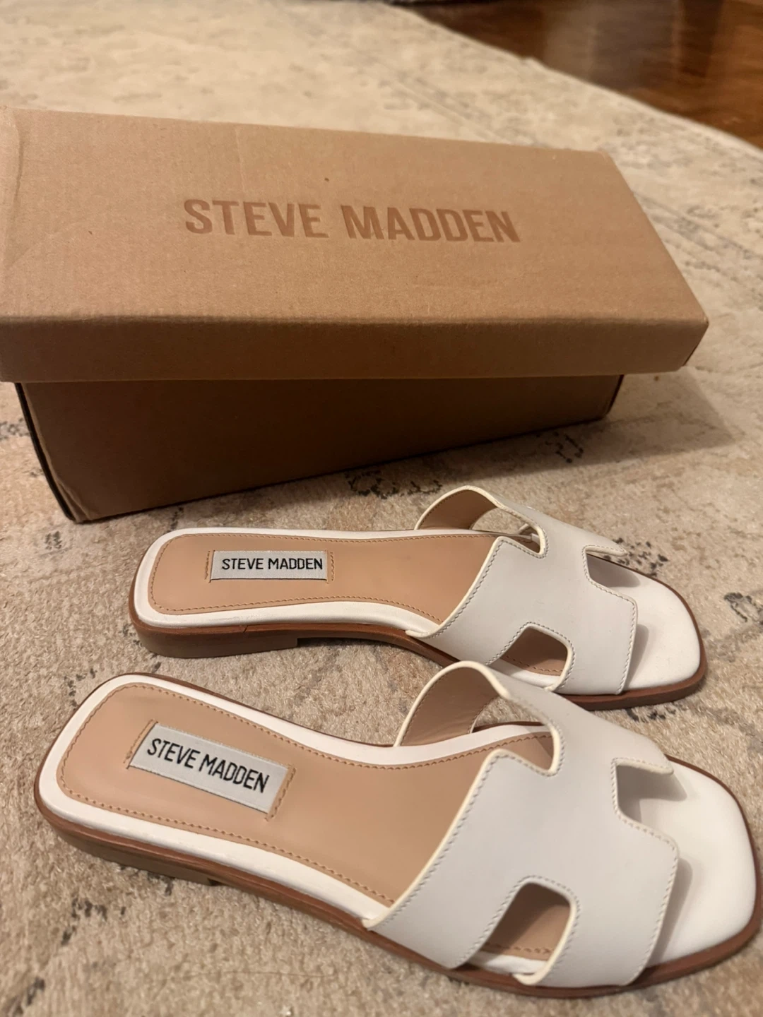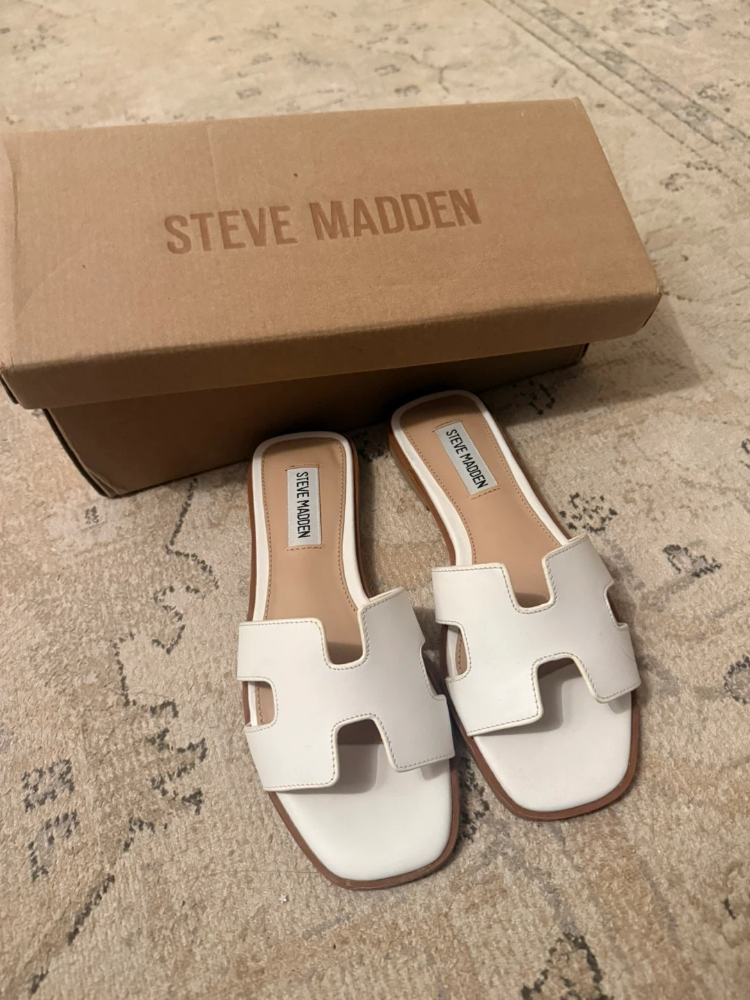 Steve Madden white flat slide sandals. These are a size 5.5. They come in the original box. Perfect for casual wear!