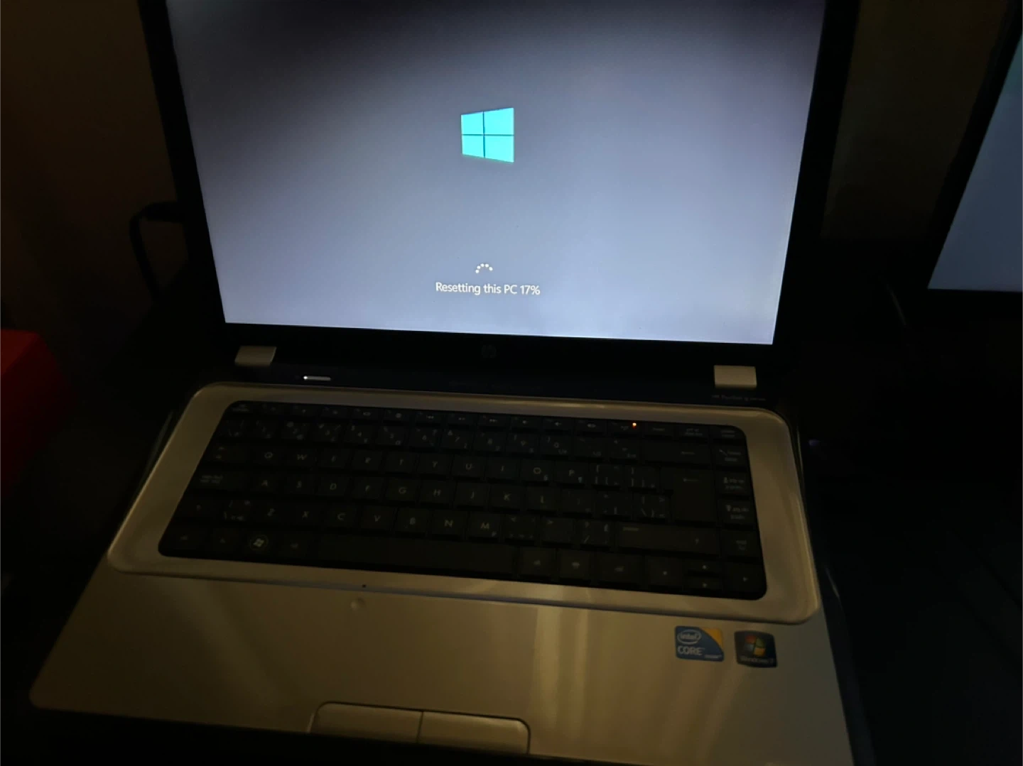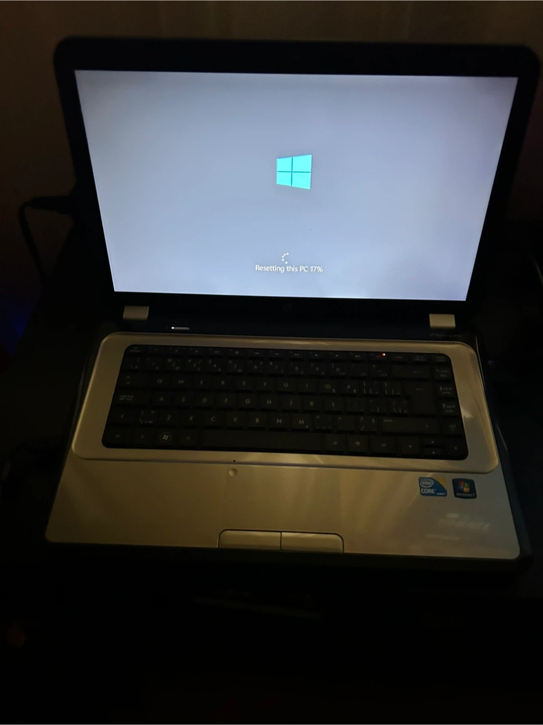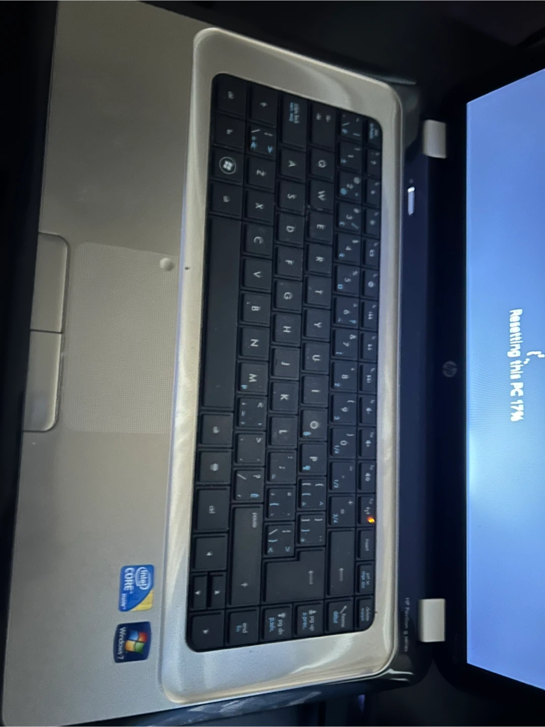 This is an HP laptop featuring an Intel i3 Core processor. It's running Windows and is currently resetting the PC. The exterior is decorated with various Care Bears stickers.