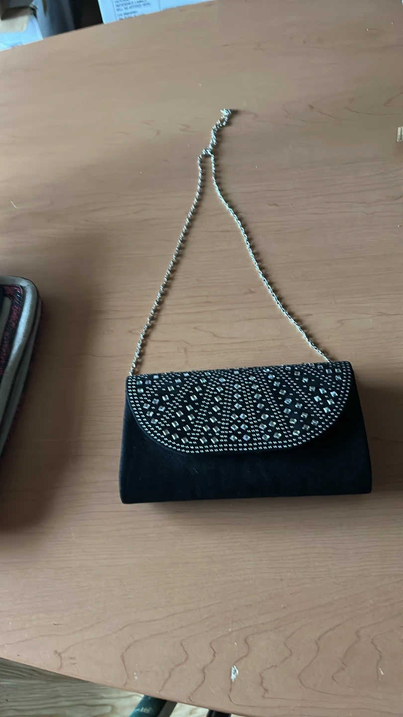 This black clutch purse features a decorative rhinestone-studded flap. It comes with a delicate silver chain strap for versatile wear. Its compact size makes it a lovely accessory for formal events.