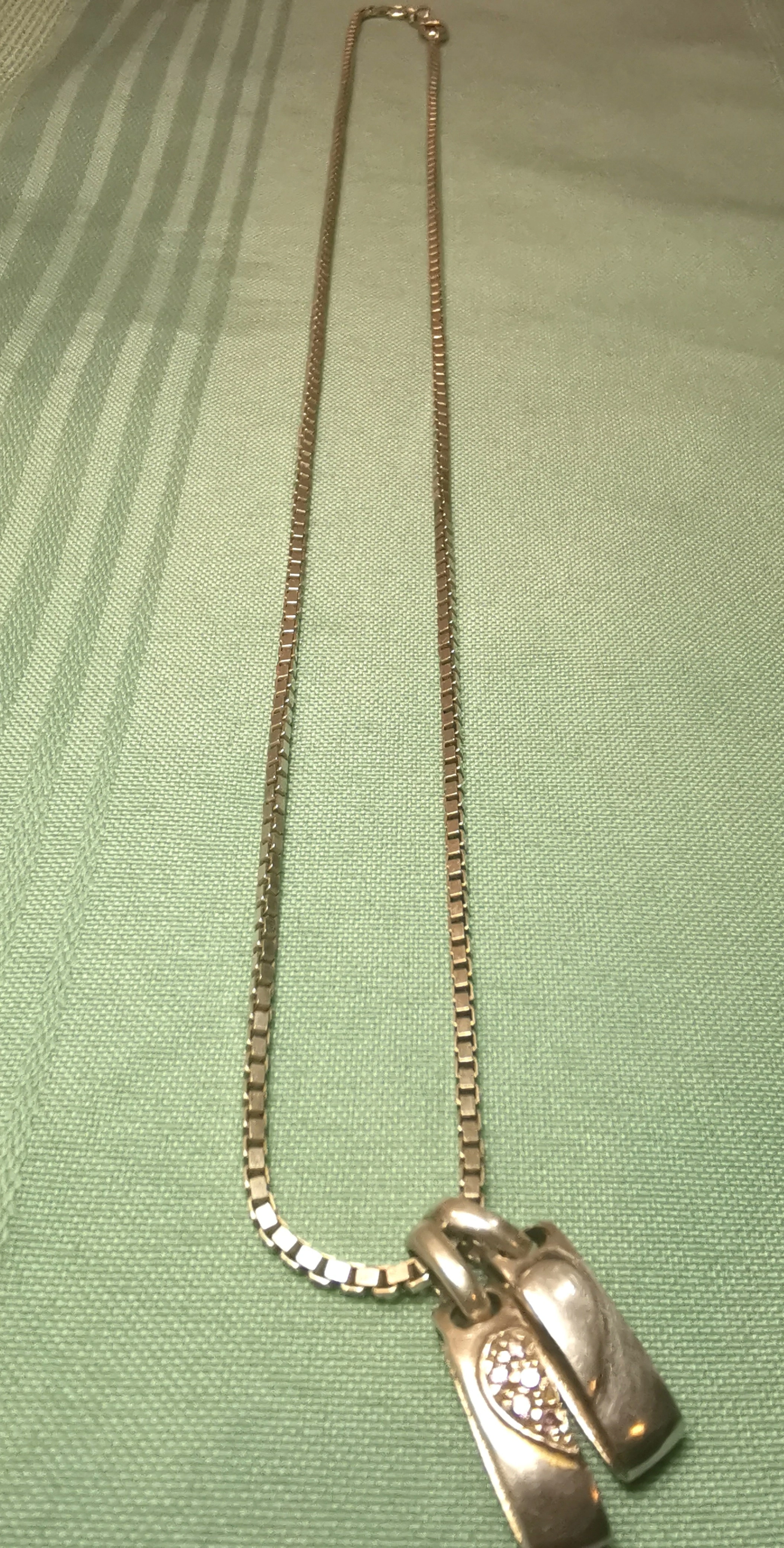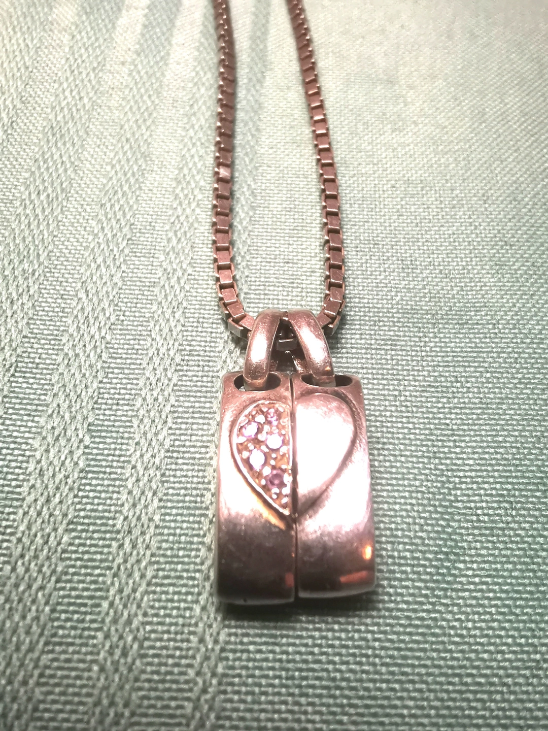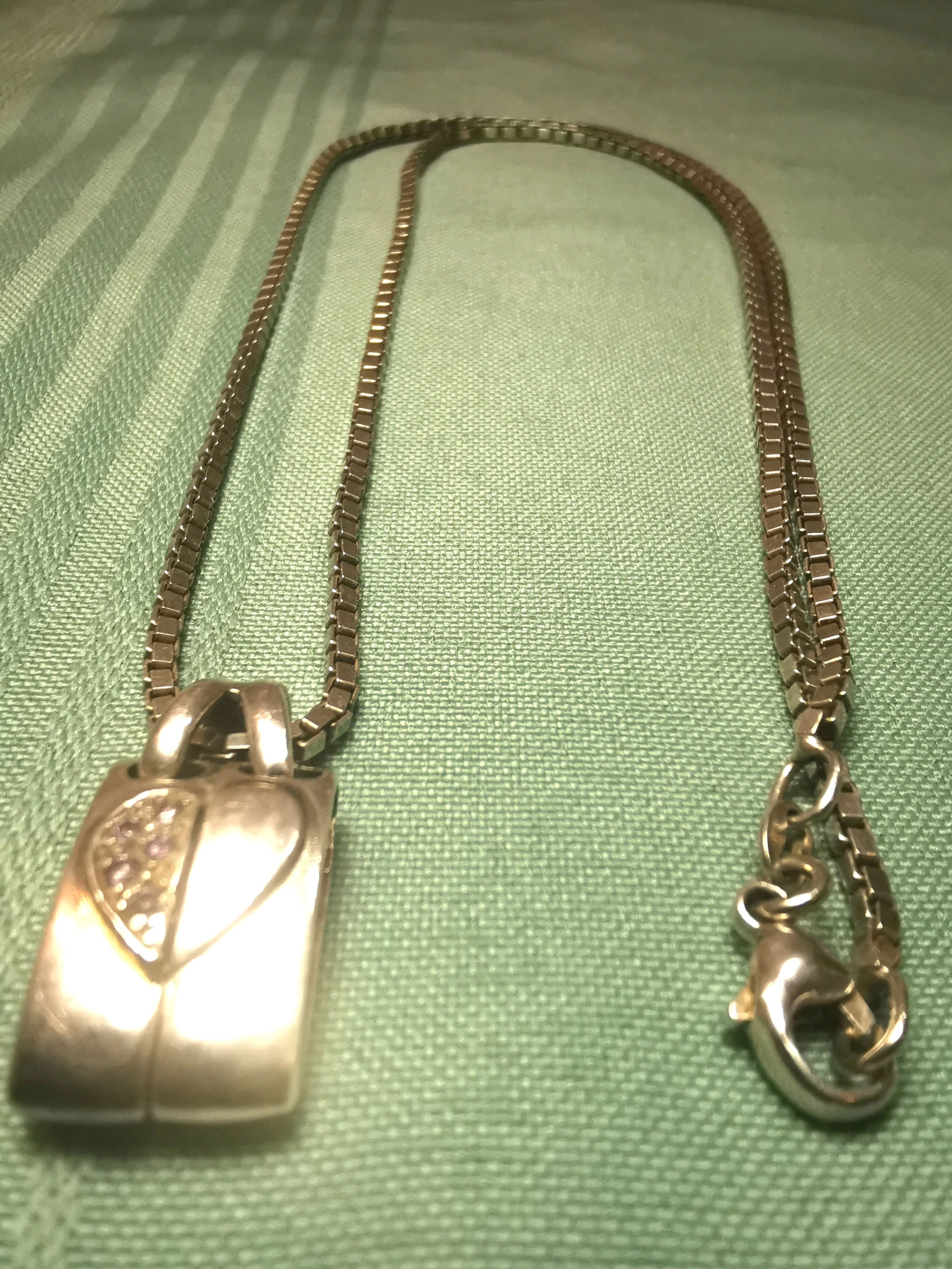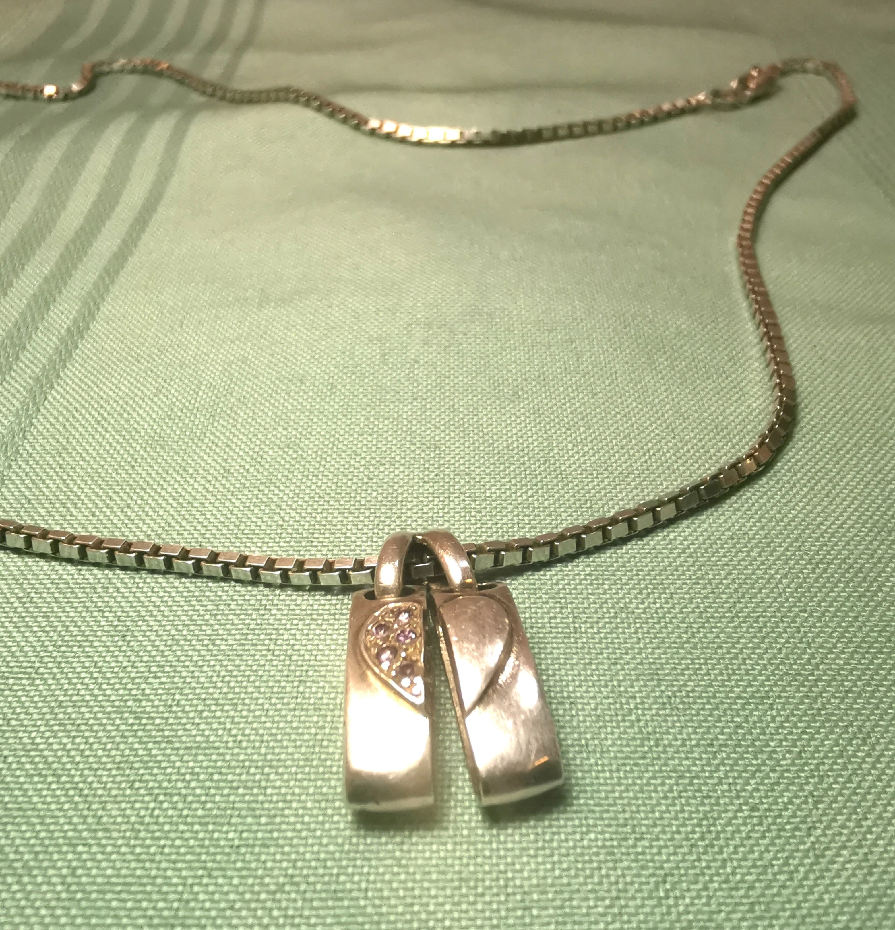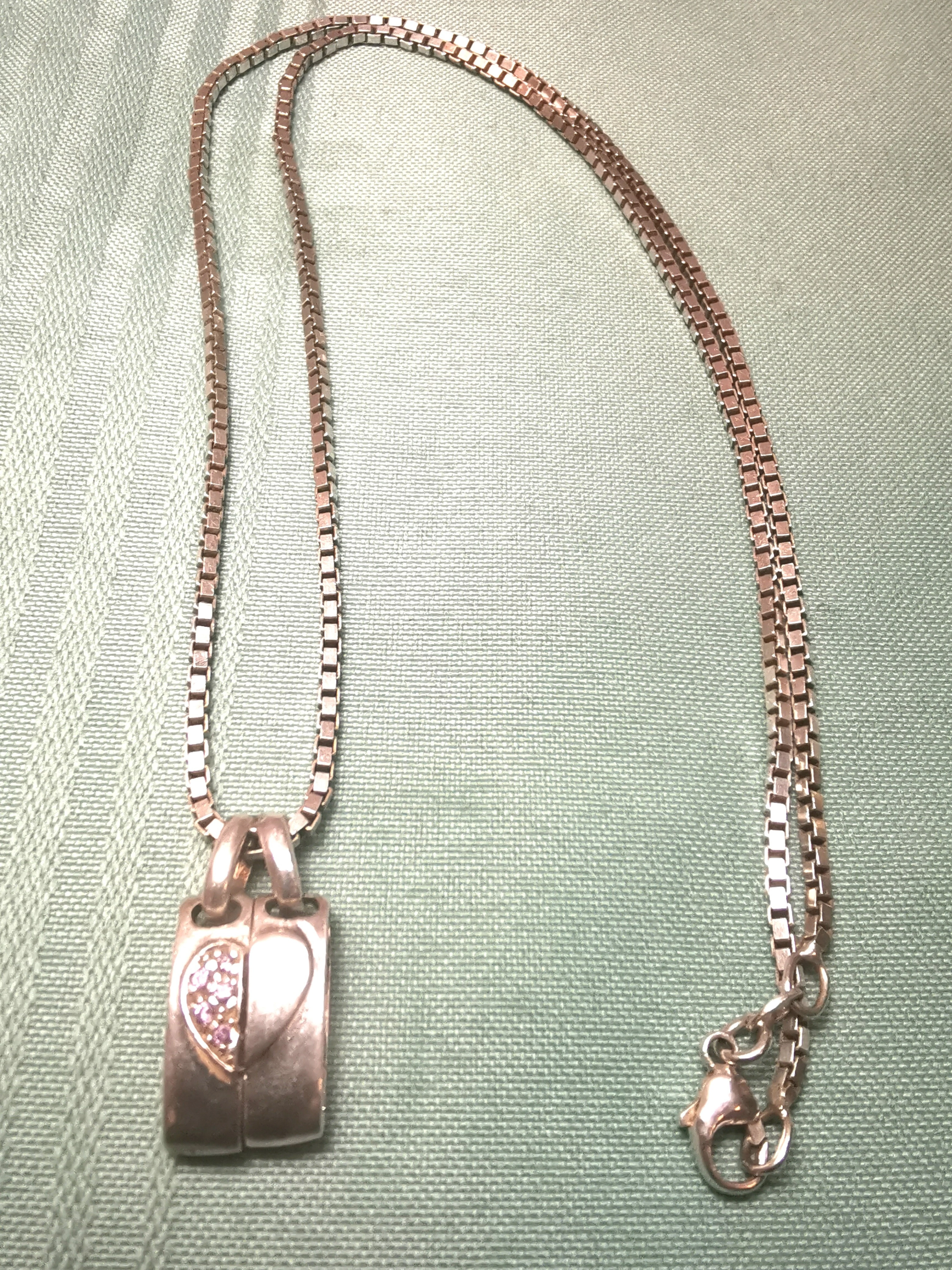 Description: This is a substantial and high-quality sterling silver necklace set manufactured in Italy by RI (Richline). The piece features a heavy, 23.5-inch Venetian box chain that has a wonderful drape and weight. The focal point is a unique, two-part heart pendant; one half is a high-polish silver and the other is pavé-set with vibrant pink and clear stones.