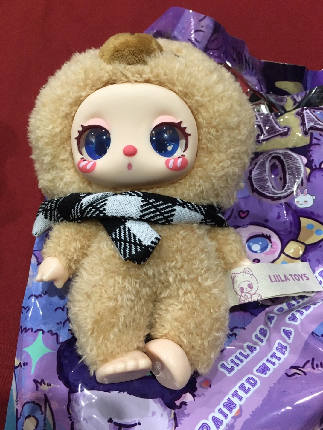 Two Lila Toys blind box dolls are available, one dressed as a panda and the other as a bear. They feature fluffy outfits and distinctive large eyes. Each doll comes in its original packaging.