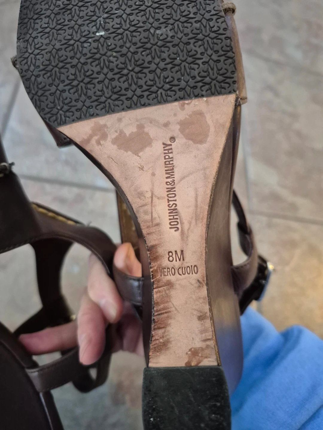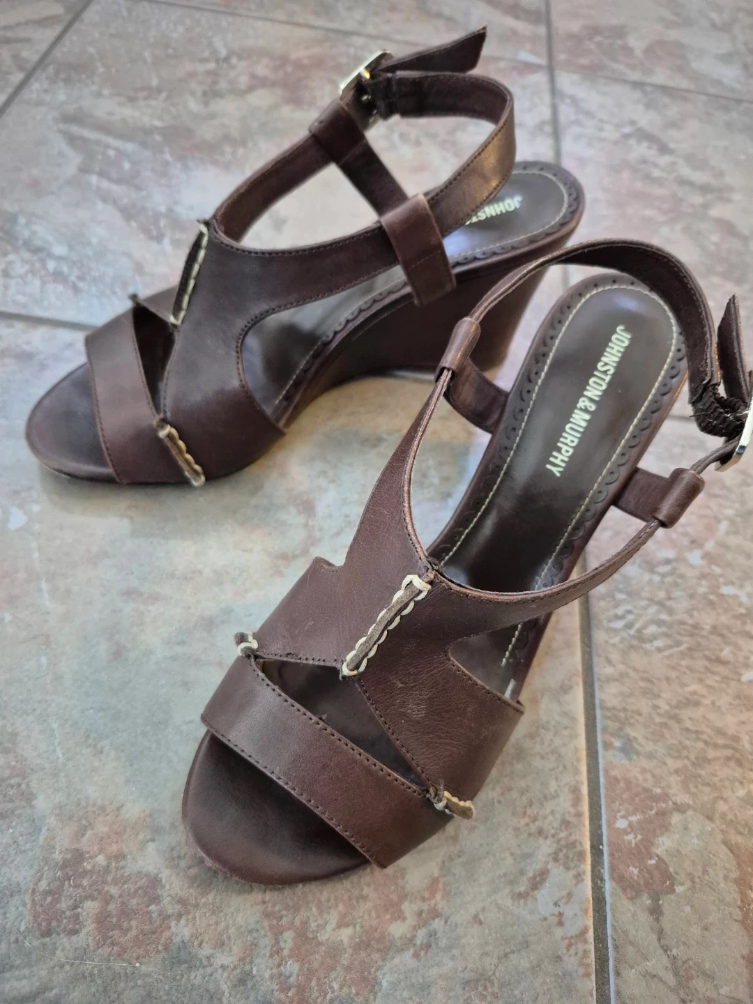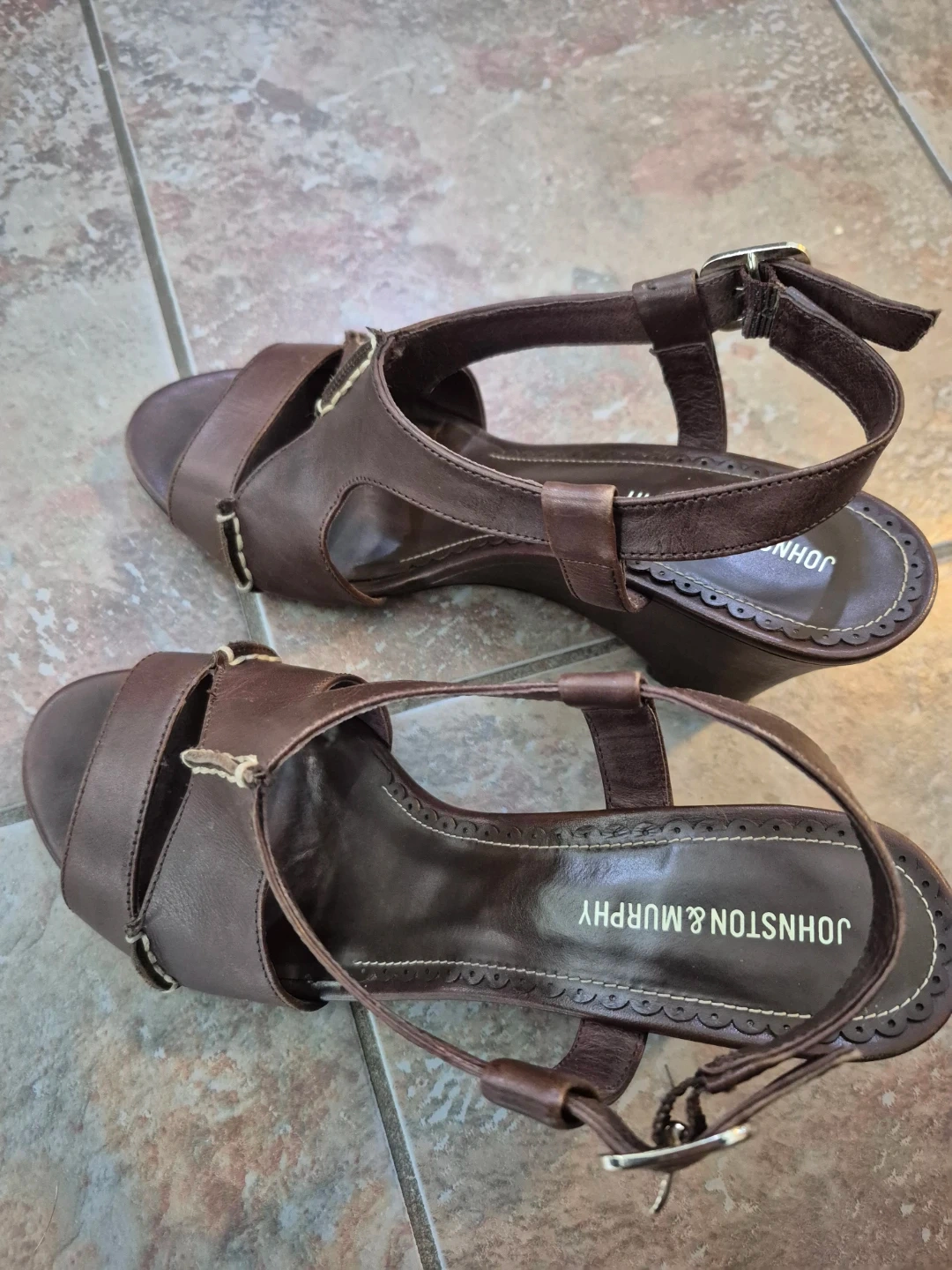 Brown leather wedge sandals from Johnston & Murphy. These are a size 8M and are made of "Vero Cuoio". They feature adjustable ankle straps and a stylish cross-strap design.