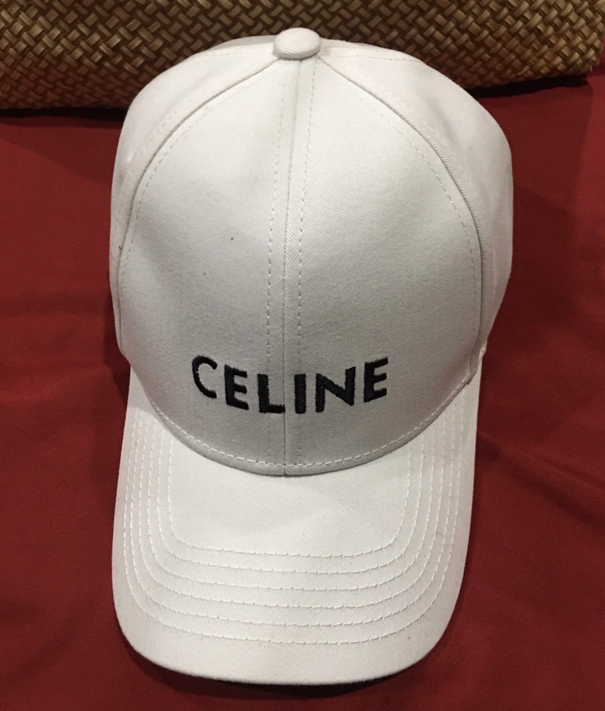White cotton baseball cap with adjustable gold buckle. Features embroidered Celine logo on the front. Made in Italy.