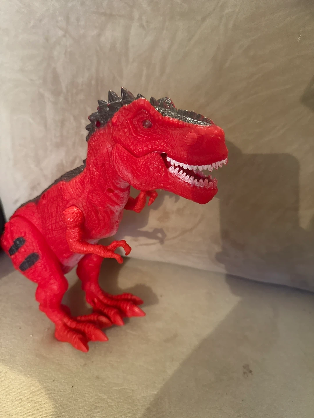 This is a bright red dinosaur toy. It has black accents on its back and tail. Its mouth is open with white teeth showing. It's made of plastic. Eyes light up and makes sound