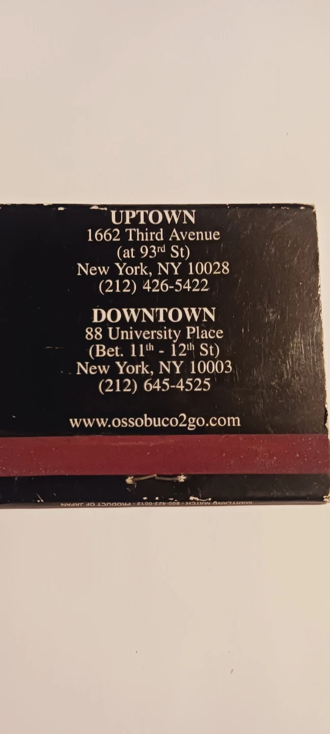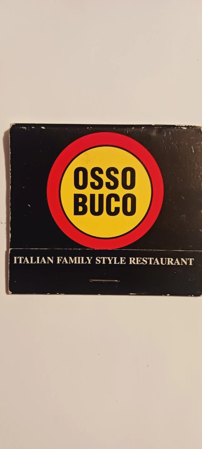 Rare Vintage Collectible matchbook from Osso Buco Italian Family Style Restaurant in NEW YORK CITY Features their logo and restaurant locations in New York City. It's from the 1980s. A neat piece of restaurant memorabilia!!! ALL MY PRICES ARE NEGOTIABLE !! ( The restaurant Osso Buco was permanently closed).