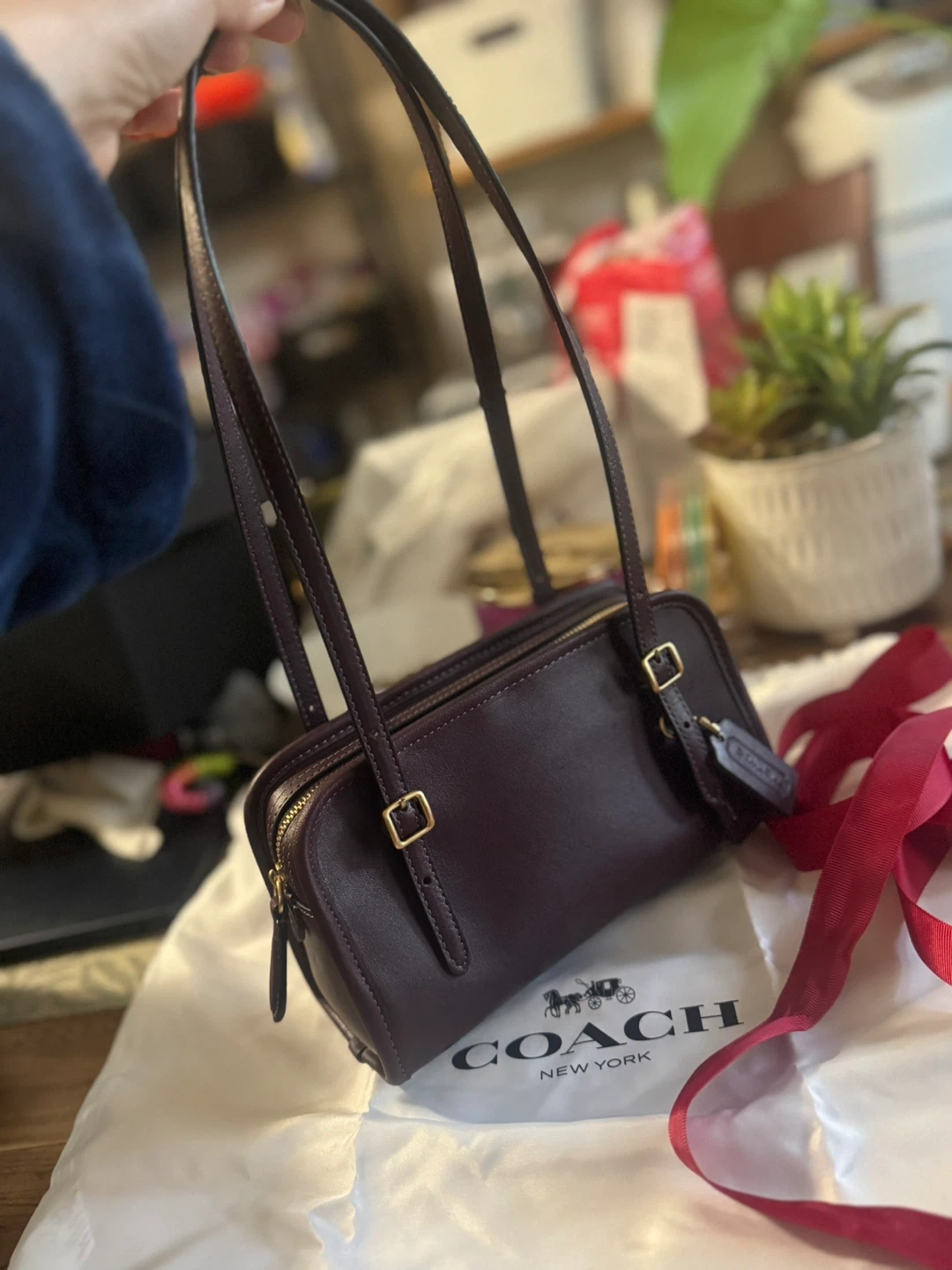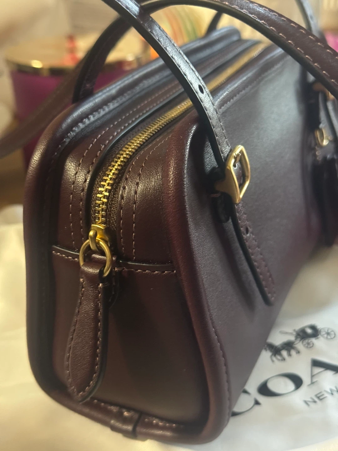 This is a dark burgundy Coach shoulder bag made of genuine glovetanned leather. It features a zip closure and an adjustable strap. It's a classic accessory for everyday use.