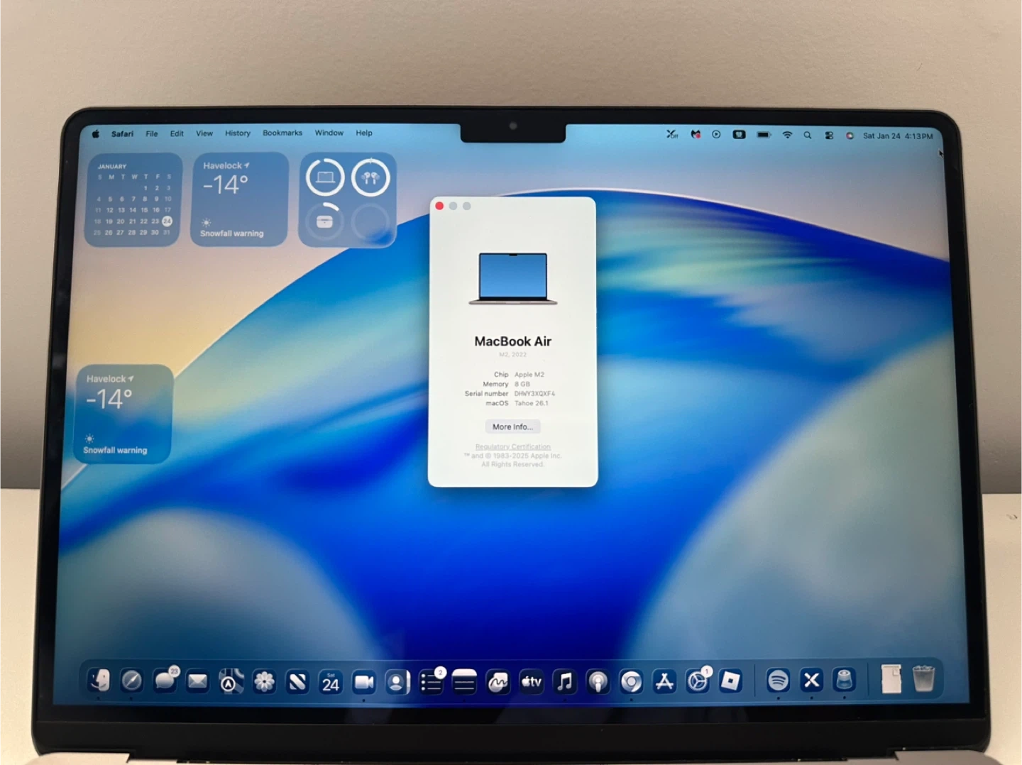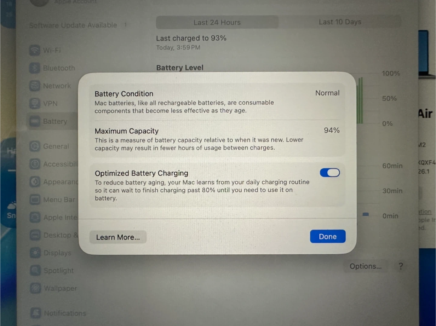This is a 2022 Apple MacBook Air with an M2 chip. It features a 13-inch display and runs macOS Sonoma. The battery capacity is at 94%.