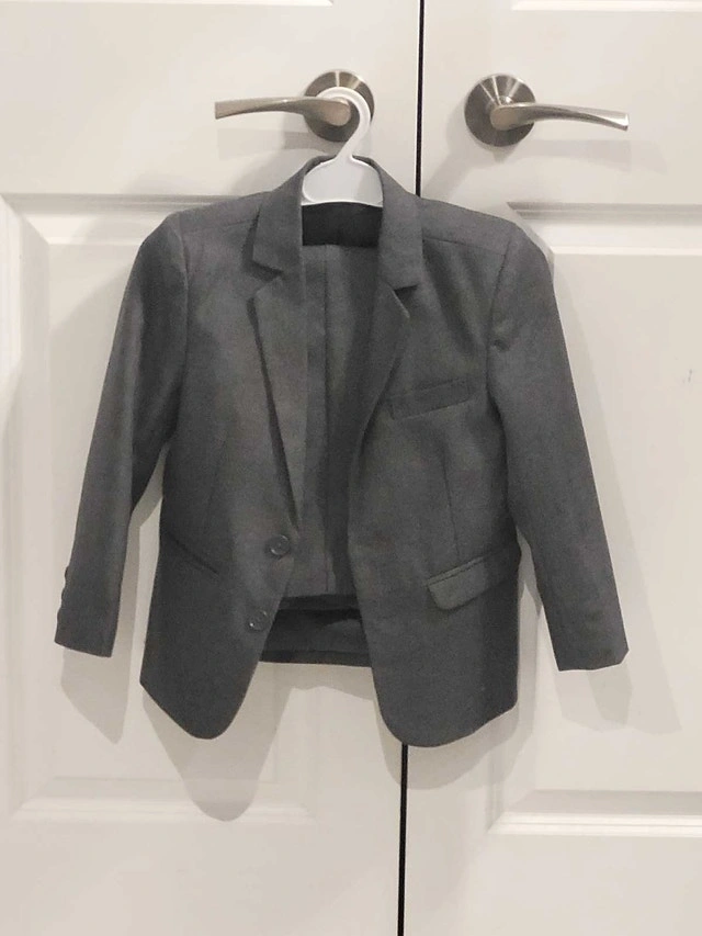 This handsome grey boys' suit includes a jacket and pants, perfect for special occasions! This suit is in like new condition, ready for your little man to make a dapper impression! Features include: Classic grey colour, Comfortable fit, Suitable for ages 6. Looking at similar listings, a boys' suit like this typically sells for around $30-$60. New, this suit costs $50. Given its condition, I've priced it to sell quickly!
