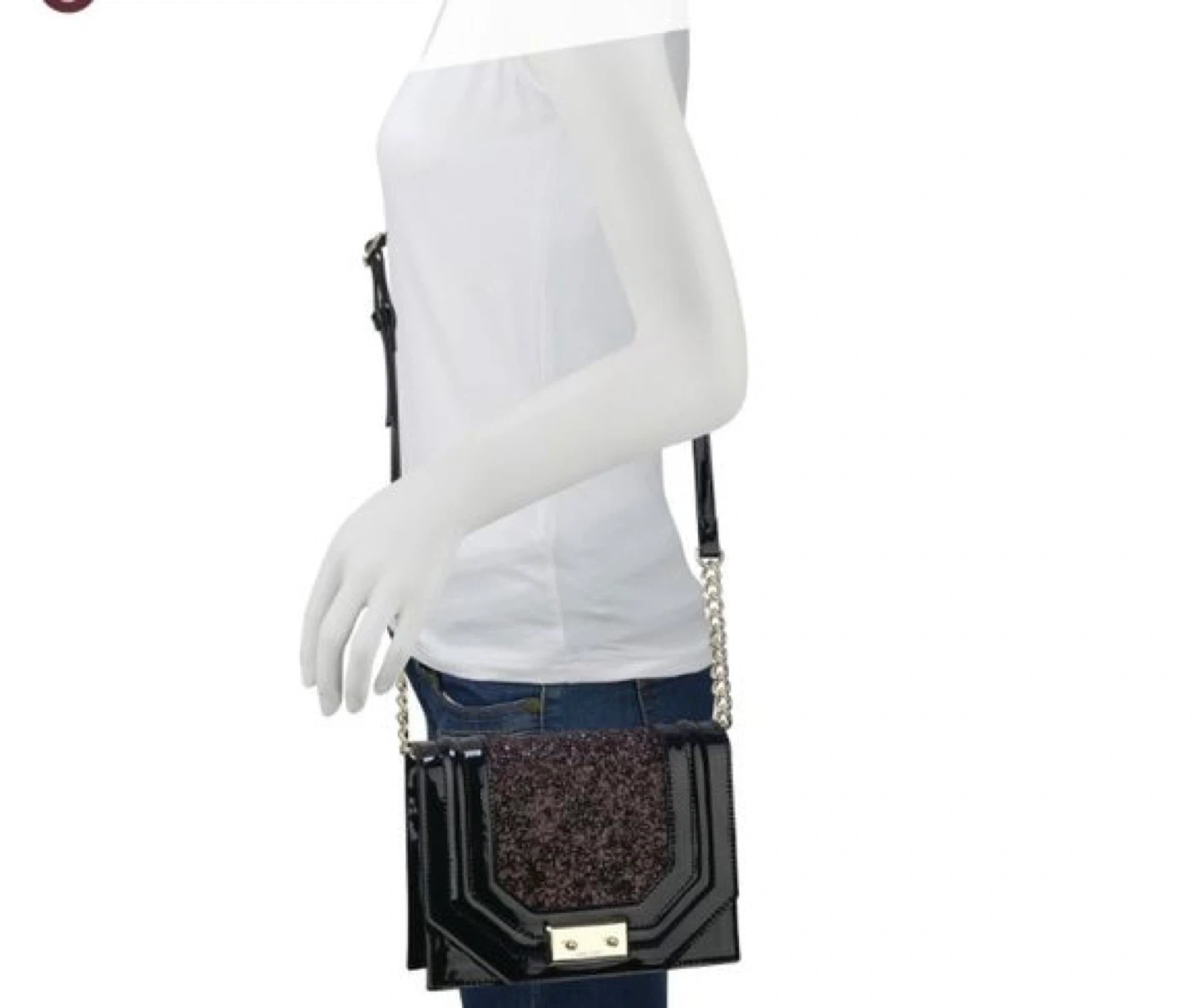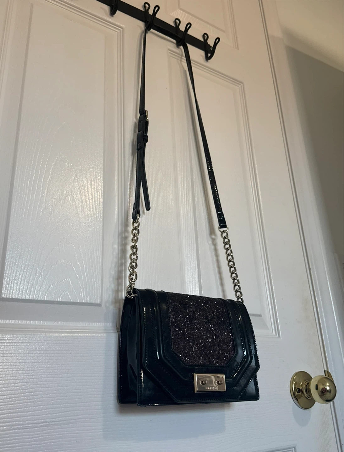 Has a shiny black patent exterior with a glitter embellished flap. It has a chain and an adjustable strap for versatile wear. The interior includes a zippered pocket. Perfect for evening parties, date nights, and special occasions!