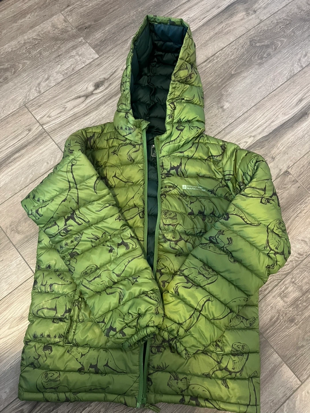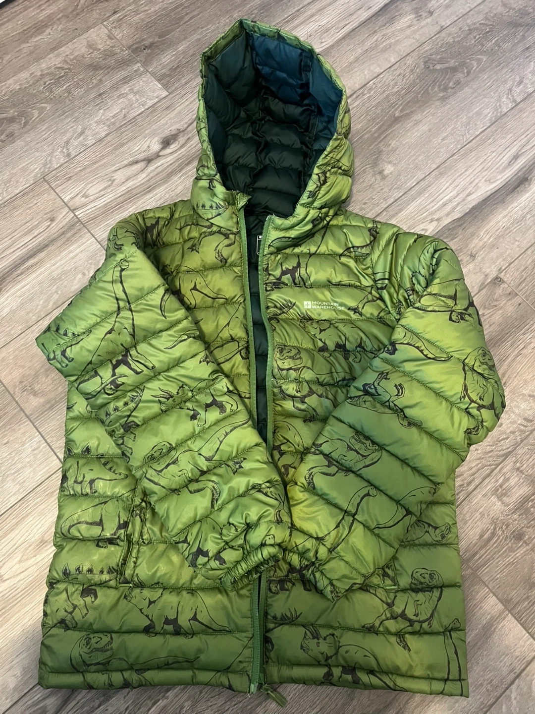 This Mountain Warehouse puffer jacket is perfect for keeping your little one warm. It's a vibrant green with a fun all-over dinosaur print. Features a full zip closure and hood.